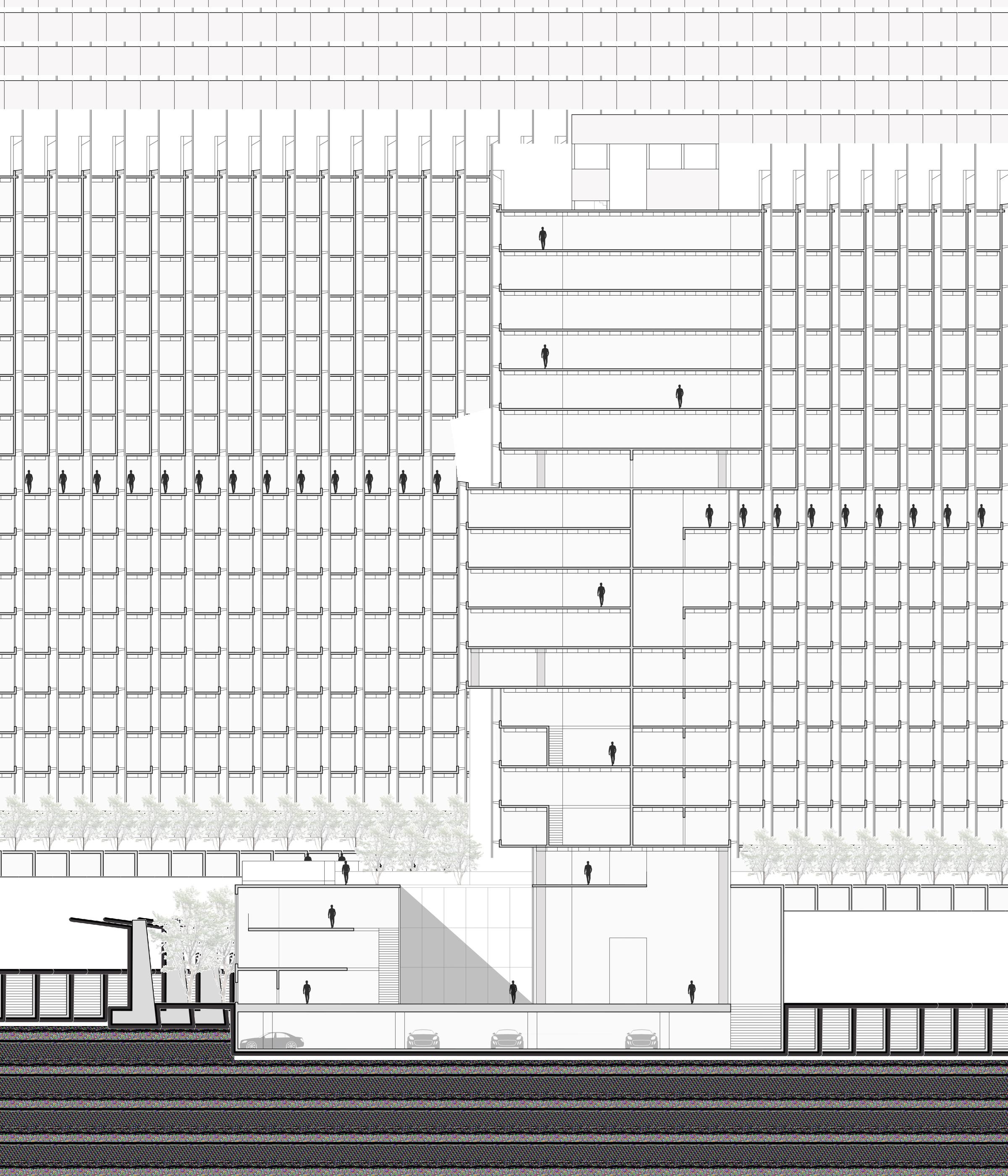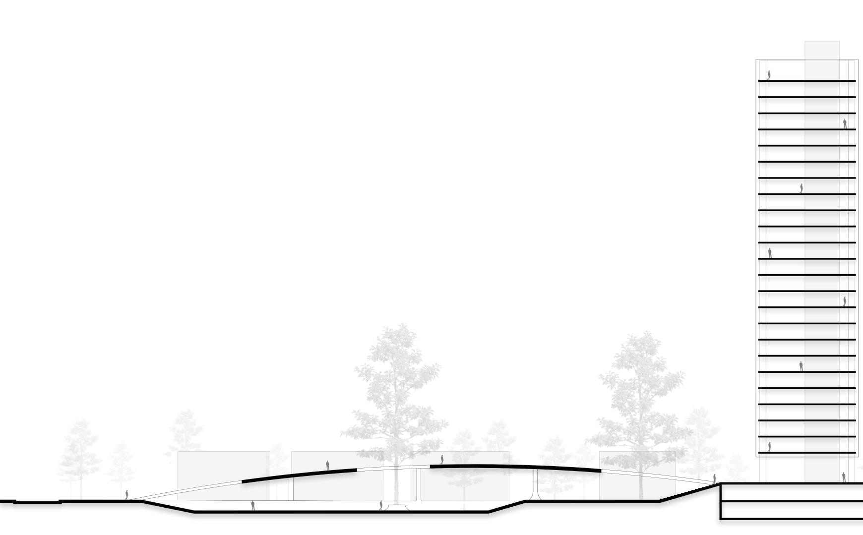 Colabora como basamento para la torre, generando actividades urbanas en la llegada al suelo.