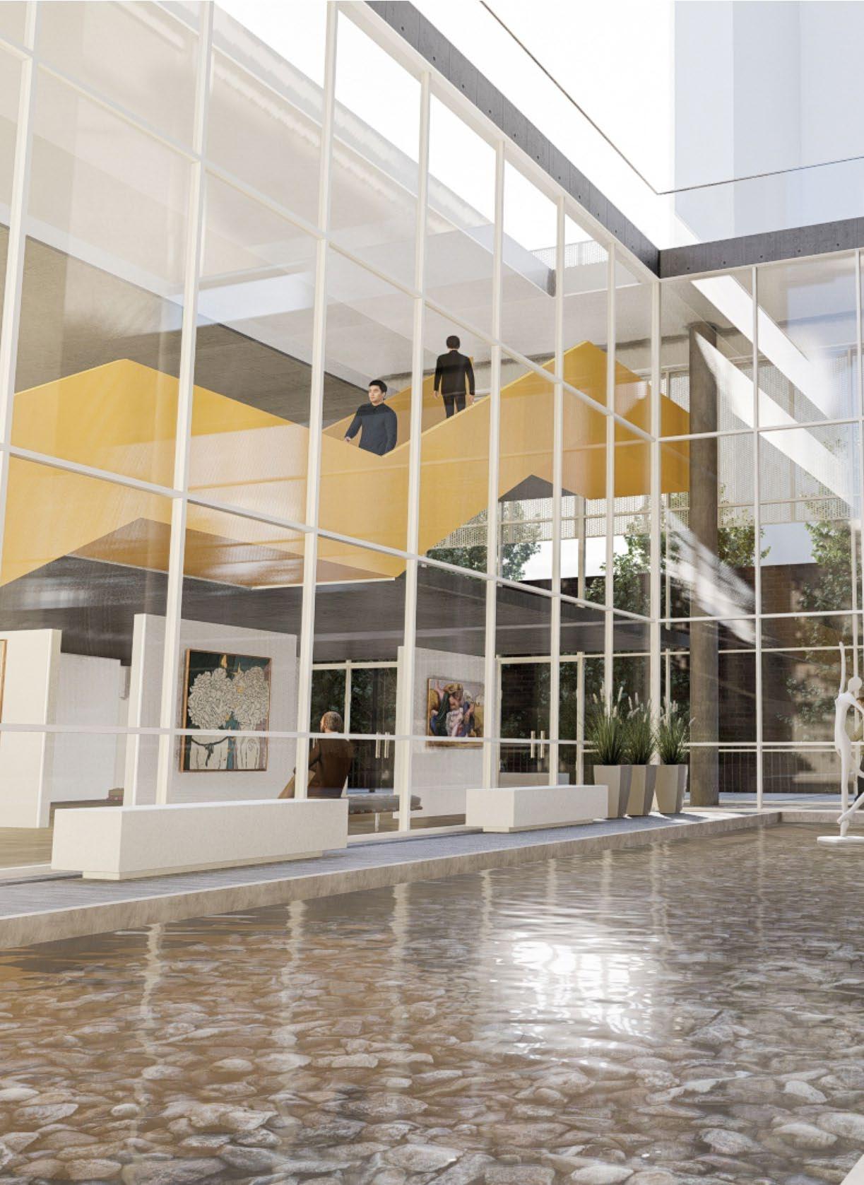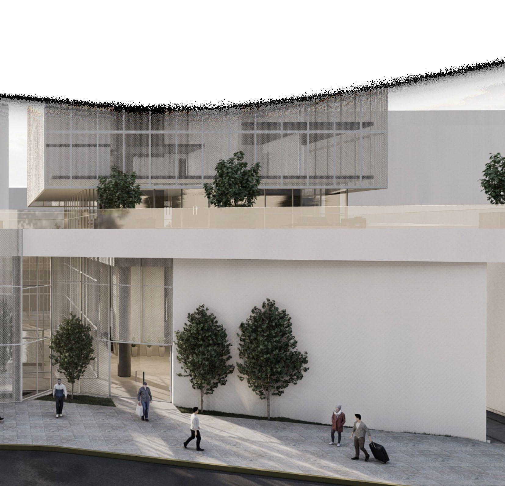 sides. The building concept originates from an environmental interpretation, it´s movement and dynamism, in a sector co-working, bar, art gallery; as well as an emphasis on the visuals, natural lighting, and contact with the green spaces.