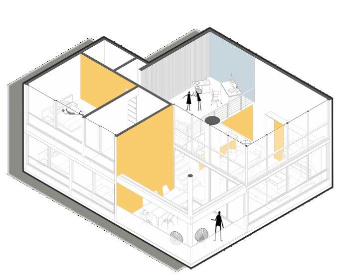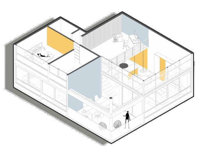 amena lectura y pureza geométrica, y hacia adentro trabajando el color en una búsqueda de confort y fomento creativo. Se el perfil urbano con la función de viviendas y amenities en donde la premisa es la flexibilidad: un espacio adaptable al