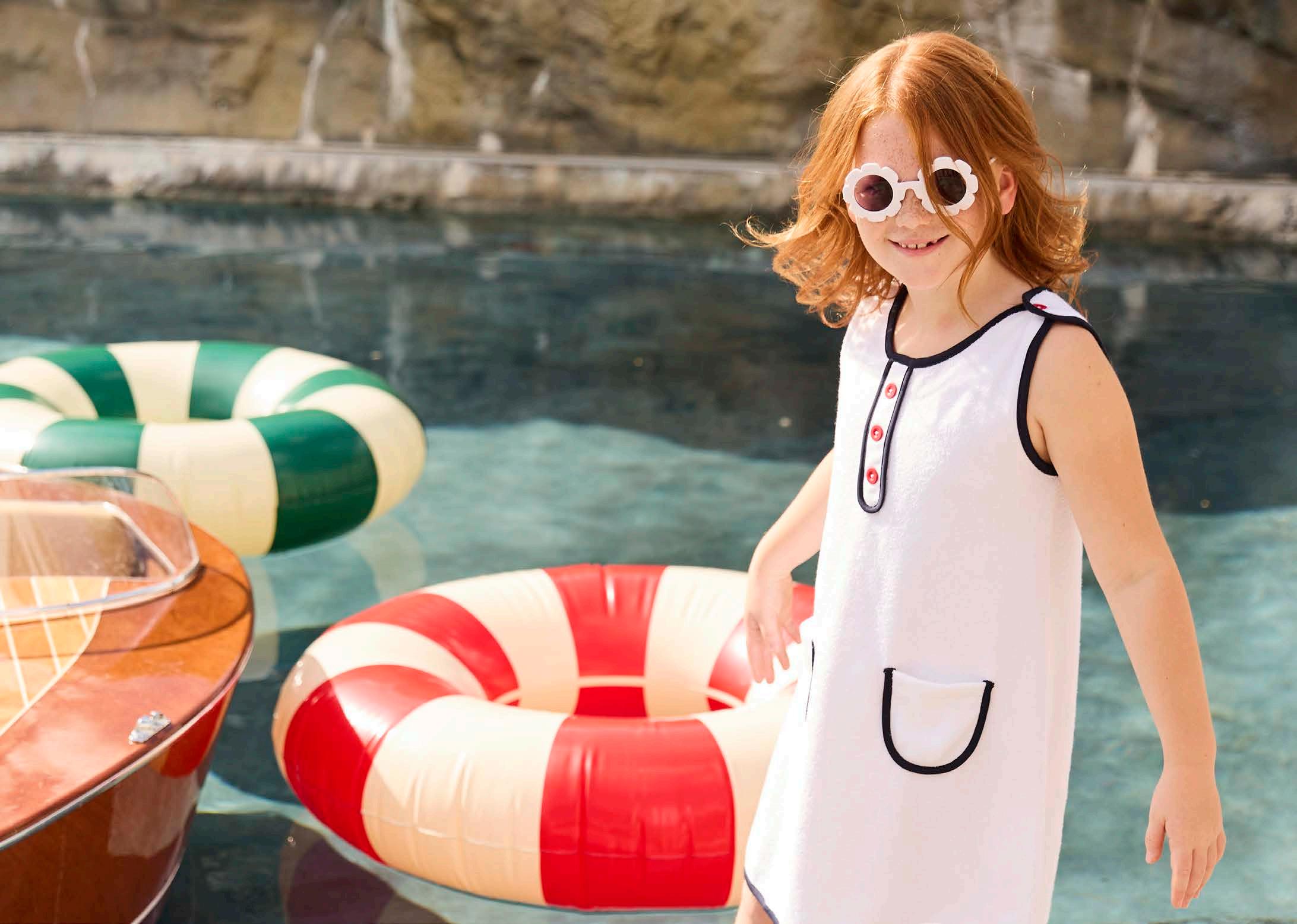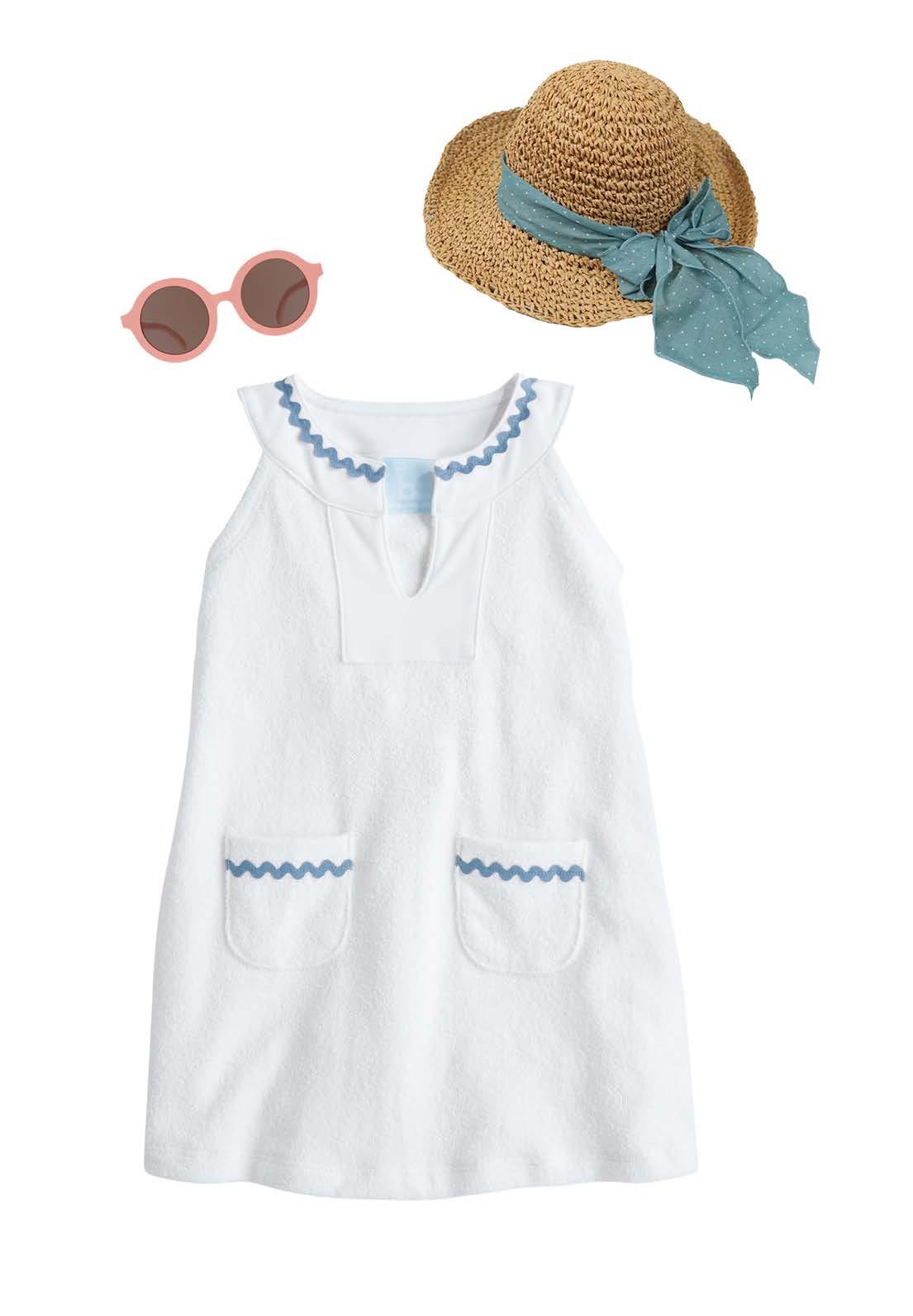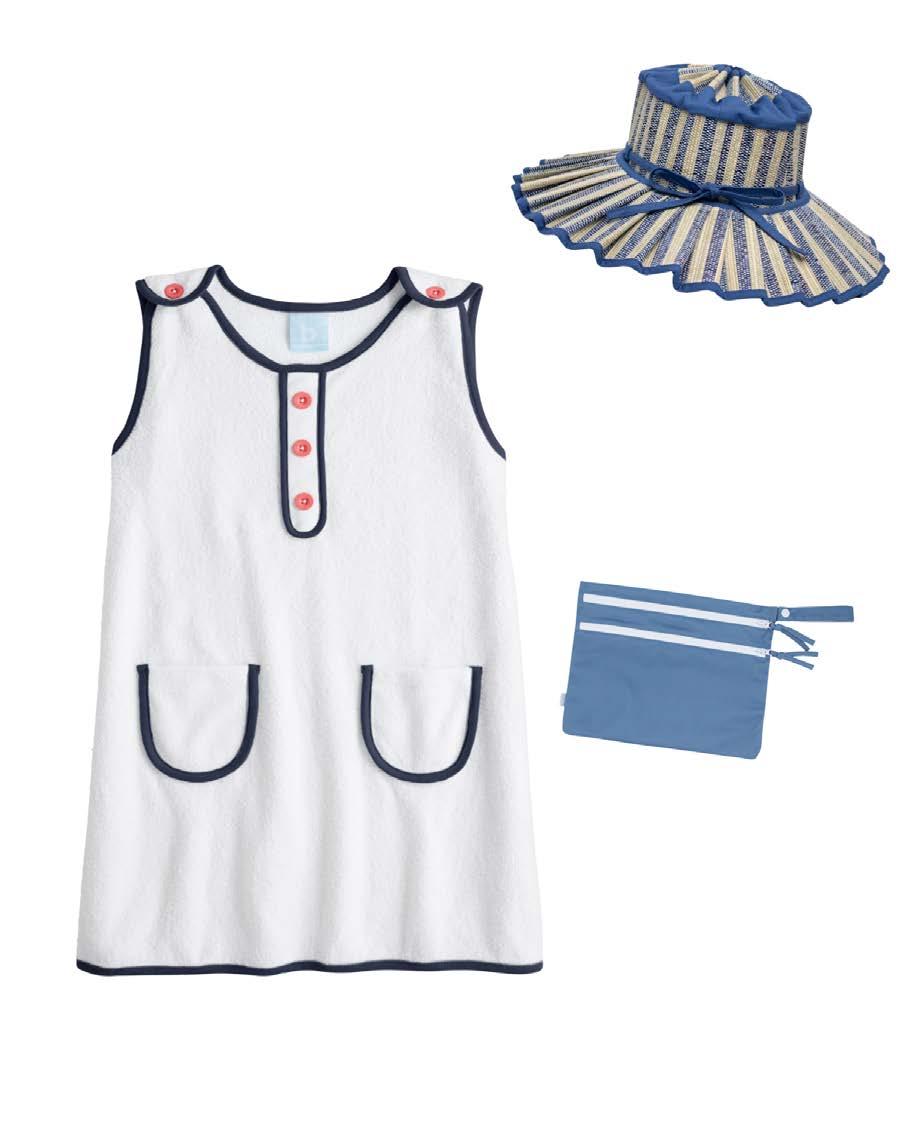 Island Capri Child Hat. Valletta. $119 | Terry Maizy Shift. White w/ Navy. Sizes 4-12y. $62 | Waterproof Wet Bag. Blue. One size. $23