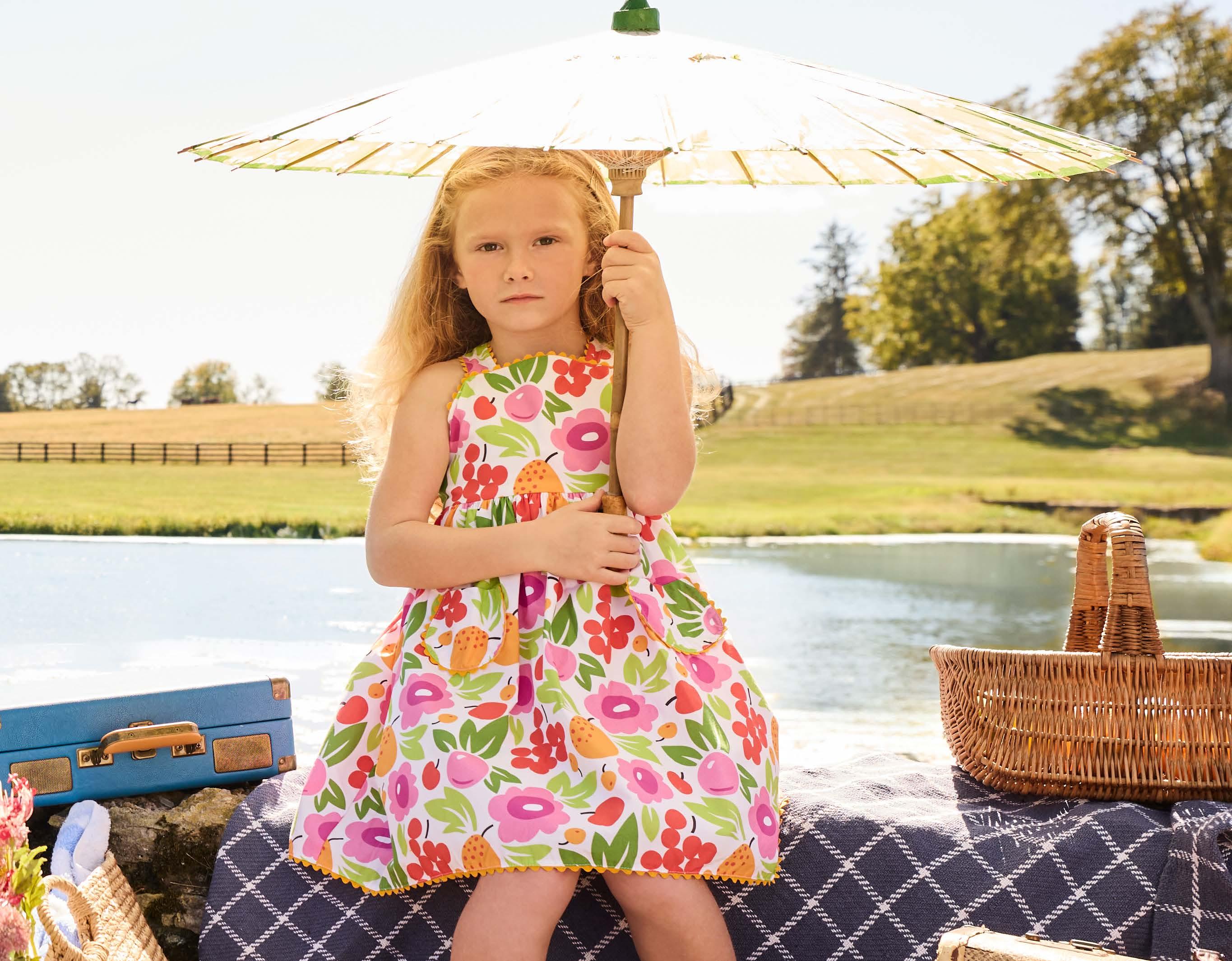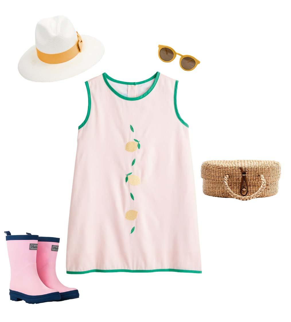 Sunglasses. Mustard. One size. $15 | Lemon Dress. Pink Pique. Sizes 4-10y. $56 | Kids Sun Hat. Mustard. One size. $65 | Picnic Basket Classic Tote. Size small. $135 | Hatley Matte Rain Boots. Pink w/ Navy Trim. Sizes 10-4. $55