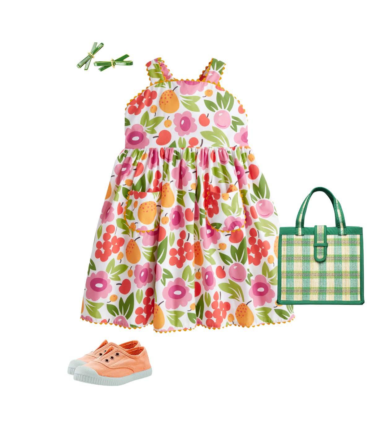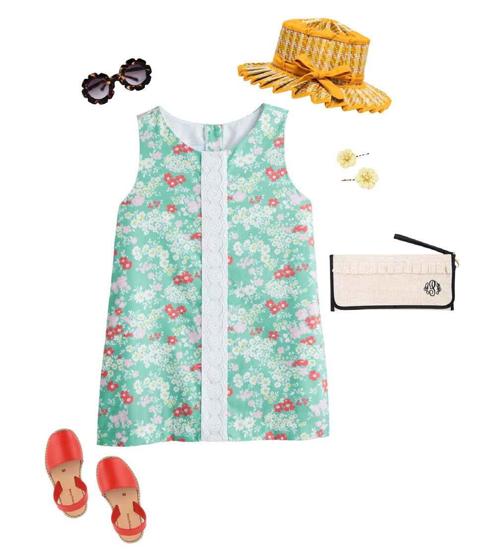 Daisy Sunglasses. Amber Tortoise. One size. $15 | Polly Shift Dress. Eden Floral. Sizes 2-10y. $54 | Luxe Mayfair Child Hat. Sundeck. One size. $75 | Poppy Enamel Bobby Pins. Yellow. Set of two. $36 | Linen Trifold Clutch. Black. One size. $17 | Summer Sandal. Avarca Pomodoro Leather. Soft Nappa Leather. Sizes 9.5-13. $65/€65 minorquines.com