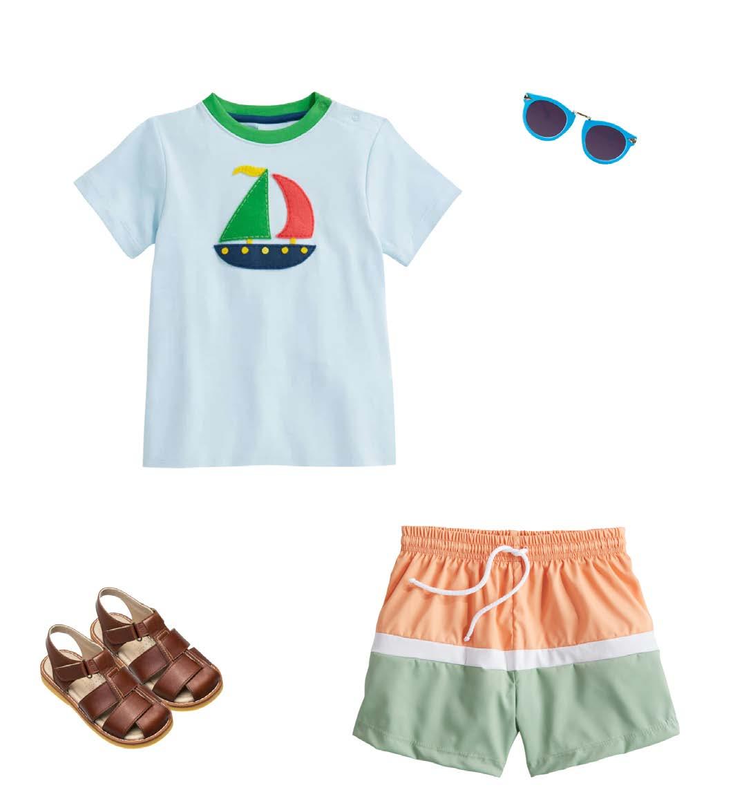 Gold Accent Sunglasses. Blue. One size. $15 | Applique Pima Tee. Blue w/ Sailboat. Sizes 2-6y. $48 | Anthony Sandals. Apache Leather. Sizes 7-10. $75 | Colorblock Bayshore Swim Trunk. Orange/Ivory/Green. Sizes 12m-8y. $52 more fashion, less fuss