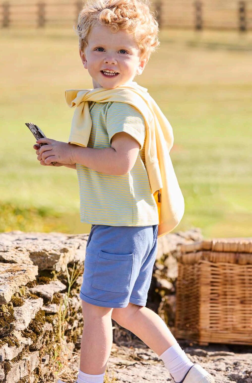 Pima Half Zip with Pocket. Yellow w/ Blue. Sizes 2-14y. $62 | Reed Jersey Polo. Blue/Yellow Thin Stripe. Sizes 2-14y. $44 | Boy’s Pima Play Short. Denim. Sizes 12m-8y. $32