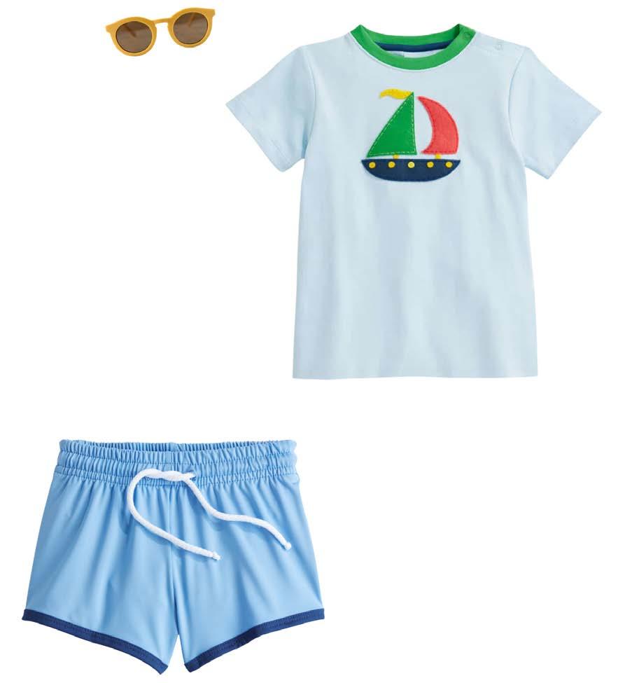 Sunglasses. Mustard. One size. $15 | Applique Pima Tee. Blue w/ Sailboat. Sizes 2-6y. $48 | Bayshore Swim Trunk. Blue w/ Navy. Sizes 12m-10y. $54