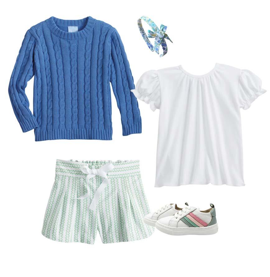 Cableknit Pullover. Royal. Sizes 4-12y. $70 | Bliss Printed Headband. Piper Floral. One size. $16 | Stormy Blouse. White. Sizes 2-10y. $38 | Printed Whitley Short. Green Ticking. Sizes 2-10y. $42 | Low Top Sneakers. Premium top-grain leather. Rainbow. Sizes 4-3. $64 limited availability.