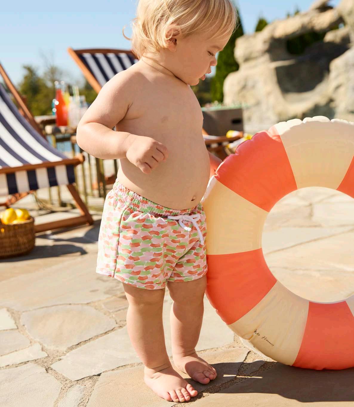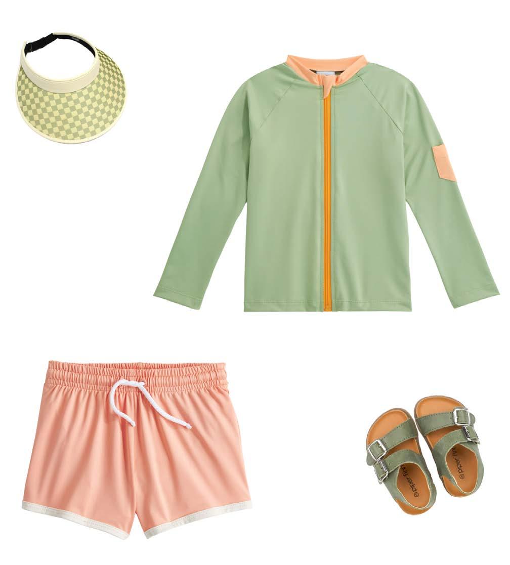 Zip Front Rash Guard With Pocket. Green w/ Orange. Sizes 12m-8y. $52 | Checkered Sun Visor. Green. One size. $24 | Buckle Sandal. Sage. Sizes 4-2. $59 limited availability | Bayshore Swim Trunk. Rose w/ Ivory. Sizes 12m-6y. $52