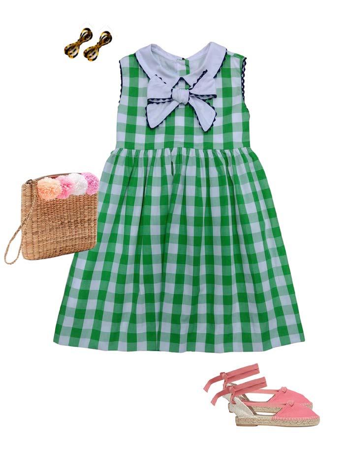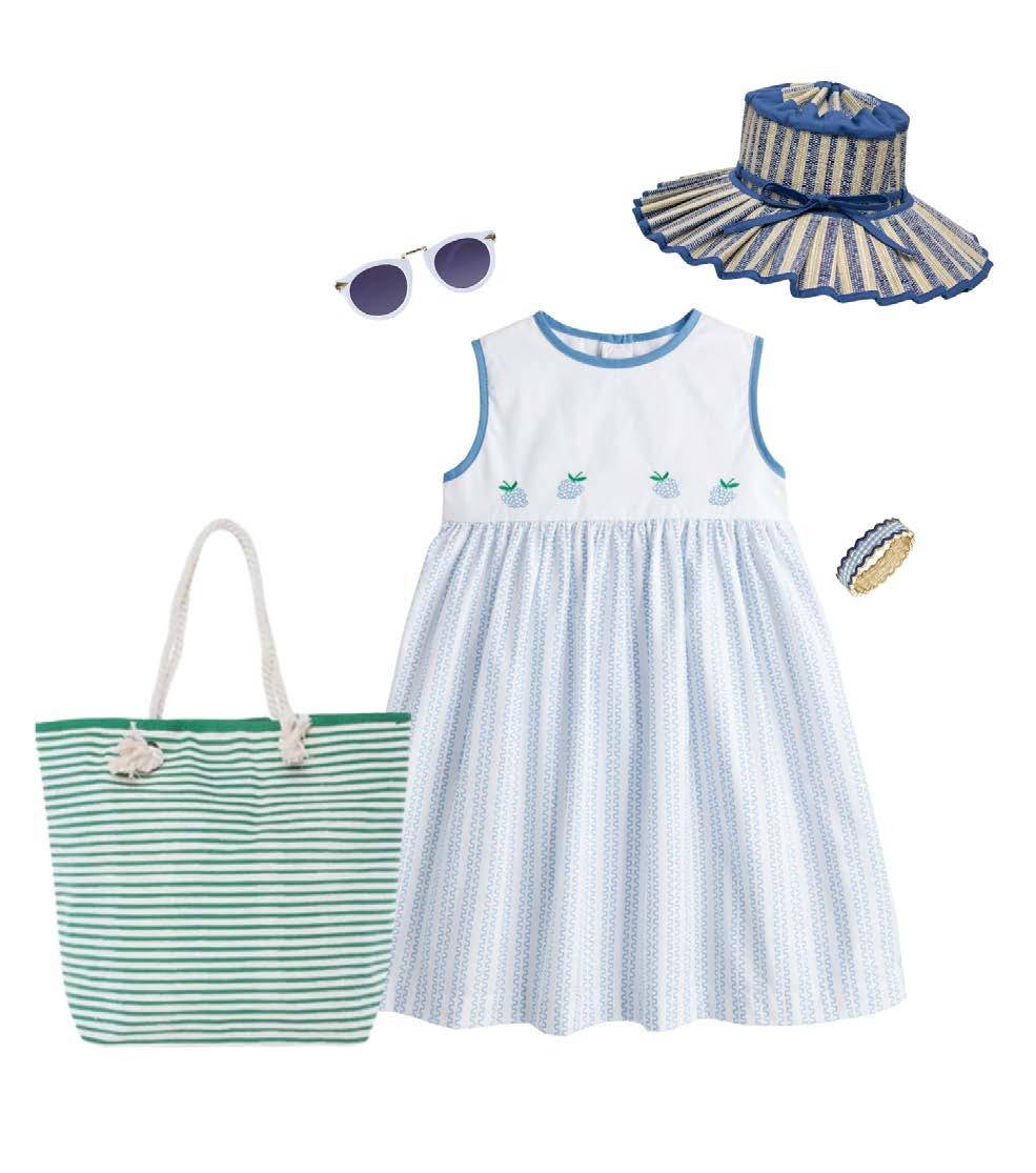 Gold Accent Sunglasses. White. One size. $15 | Island Capri Child Hat. Valletta. $119 | Embroidered Regina Dress. Blue Ticking w/ Grapes. Sizes 2-6y. $72 | Annalise Gingham Statement Bracelet. Blue. $52 | Knotted Rope Tote. Emerald. One size. $48