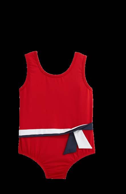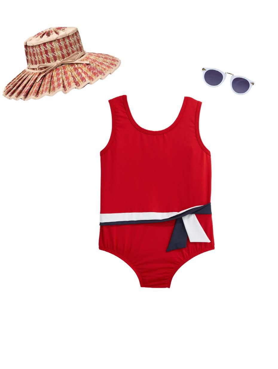 Luxe Capri Child Hat. Vernazza. One size. $136 | Gold Accent Sunglasses. White. One size. $15 | Christy Bathing Suit. Red w/ Navy & White. Sizes 2-8y. $72