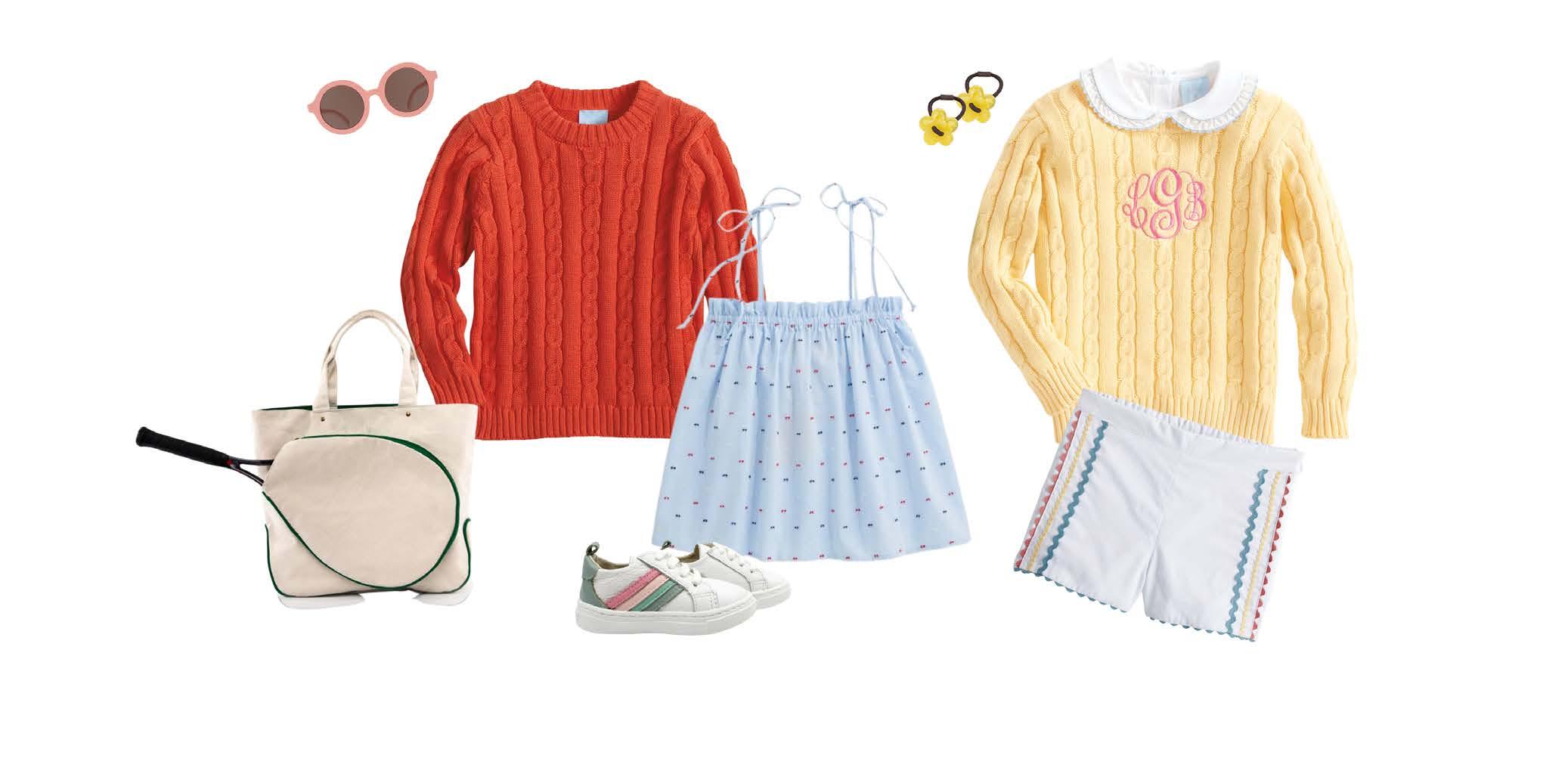 Island Cabana Sun Visor. Shelter. One size. $43 | Gold Accent Sunglasses. White. One size. $15 | Poppy Enamel Bobby Pins. Pink. Set of two. $36 | Intarsia Argyle Pullover. Ivory w/ Multicolor. Sizes 4-12y. $88 | Pima Ruffle Polo. Bitsy Berry. Sizes 6-14y. $44 | Enamel Tennis Ball Bali Bracelet. Green, Pink. One size. $28 | Scalloped Tennis Skort. White Pique w/ Green. Sizes 2-14y. $46 | Darwin Mini Gallery Tote. $133 | Low Top Sneakers. Premium top-grain leather. White. Sizes 4-3. $64 limited availability.
