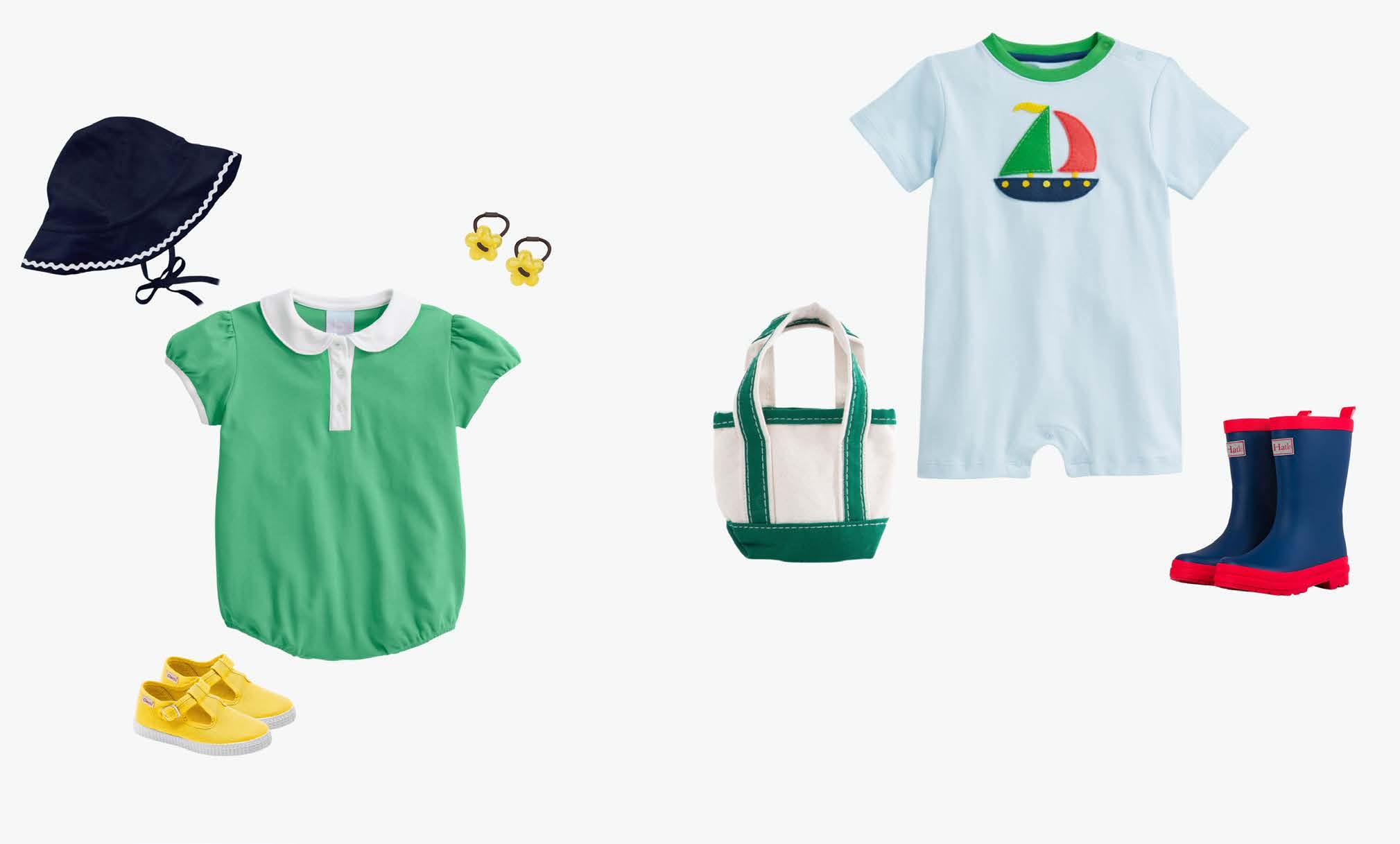 Mini Classic Tote. Green. One size. $12 | Boy’s Applique Pima Romper. Blue w/ Sailboat. Sizes 3-24m. $52 | Hatley Matte Rain Boots. Navy w/ Red Trim. Sizes 10-4. $55 Chapman Buttondown.