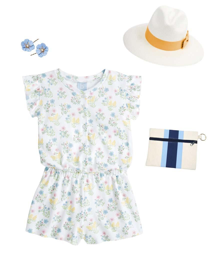 Gold Accent Sunglasses. White. One size. $15 | Terry Worth Shift. Navy w/ White. Sizes 4-14y. $58 | Sumi Leather & Rattan Sun Visor. Black. One size. $45 | Annalise Gingham Statement Bracelet. Blue. $52 Kids Sun Hat. Mustard. One size. $65 | Printed Pima Collette Romper. Bea’s Bouquet. Sizes 4-14y. $56 | Canvas Kansas Zipper Pouch. Navy w/ Light Blue. One size. $18 shop these looks on our website bellabliss.com