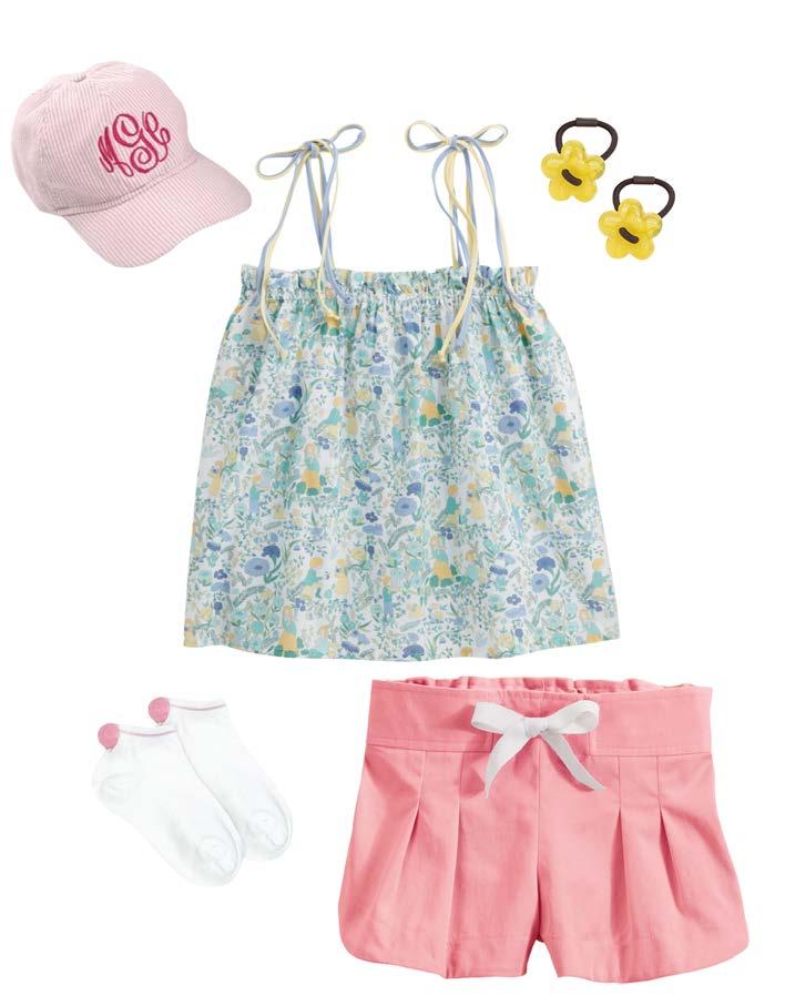 Baseball Hat. Pink Seersucker Stripe. Sizes toddler, child, adult. $20 | Spring Flower Ponytail Hair Tie. Yellow. $1.70 | Ella Blouse. Piper Floral. Sizes 4-14y. $48 | Whitley Short. Sorbet. Sizes 2-8y. $42 | Pom Pom Low Cut Socks. White w/ Pink. Sizes XS, S, M. $5.99