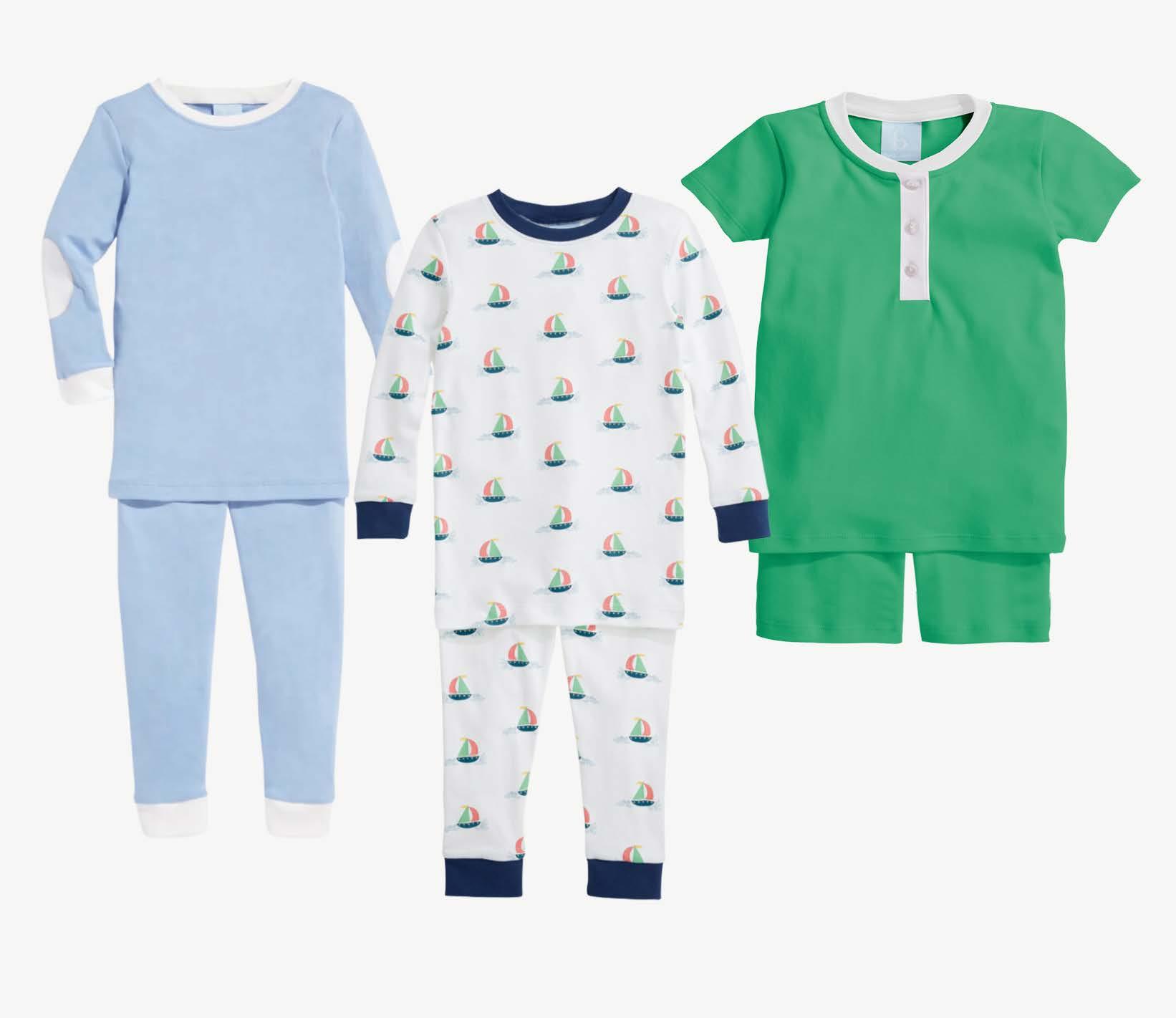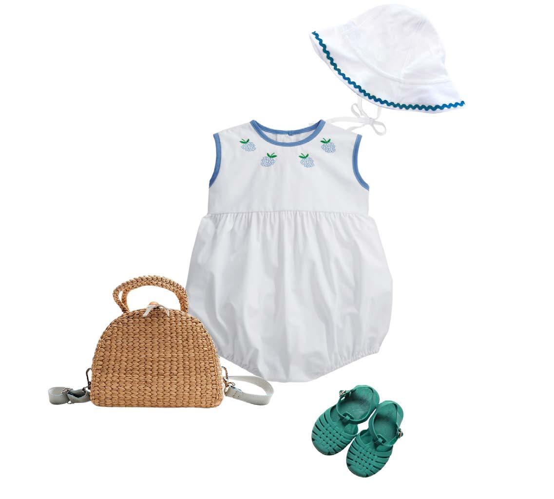 Calloway Sun Hat. White w/ Moody Blue. Sizes s (6-12m), m, (12-24m), l (2-4y). $32 | Kids Convertible Backpack. Dusty Blue. One size. $70 | Classical Jelly Sandals. Green. Sizes 6.5-10.5. $29.99 | Embroidered Jackie Bubble. Blue Ticking w/ Grapes. Sizes 3-24m. $62