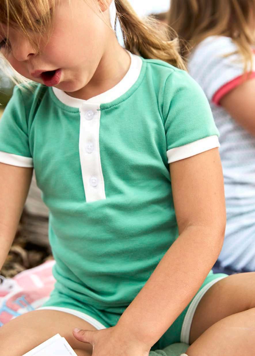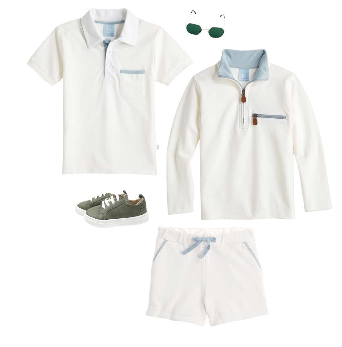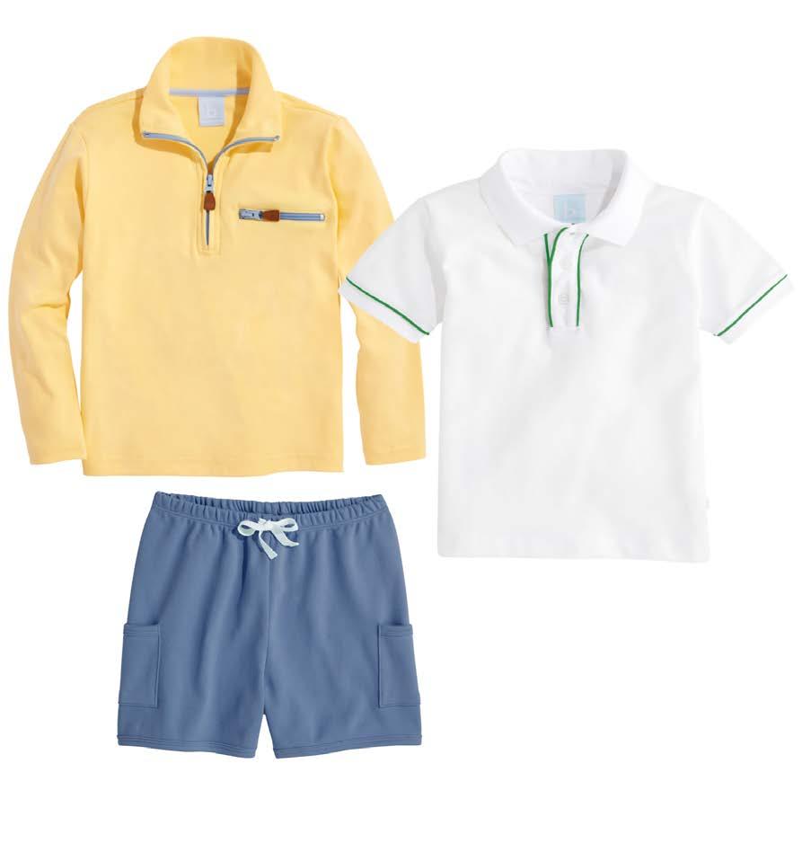 Pima Half Zip with Pocket. Yellow w/ Blue. Sizes 2-14y. $62 | Contrast Trim Pique Polo. White w/ Green. Sizes 12m-12y. $46 | Boy’s Pima Play Short. Denim. Sizes 12m-8y. $32