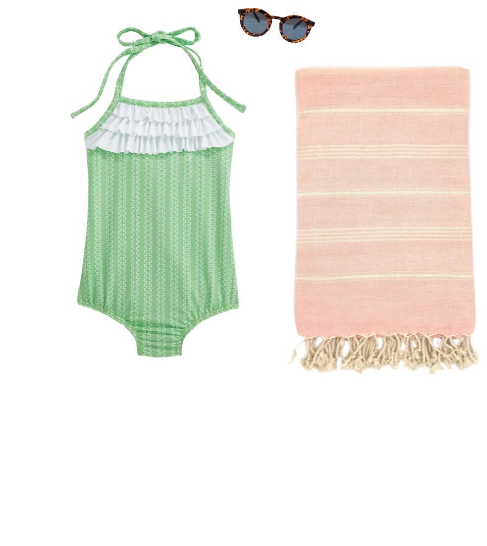 Alys Bathing Suit. Green Trellis. Sizes 12m-8y. $78 | Sunglasses. Amber Tortoise. One size. $15 | Fiji Beach & Bath Towel. Peach. One size. $45