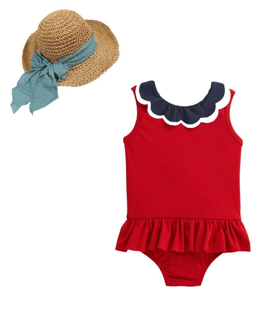 Straw Hat. Natural w/ Ribbon. One size. $42 | Colorblock Summer Bathing Suit. Red w/ Navy & White. Sizes 12m-6y. $90