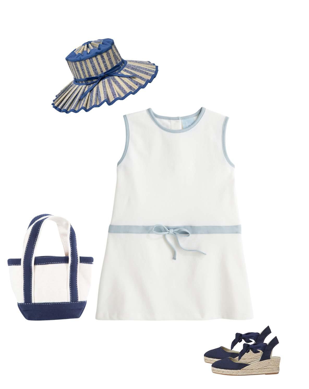 Island Capri Child Hat. Valletta. $119 | Pique Strafford Dress. Ivory w/ Moody Blue. Sizes 2-14y. $58 | Mini Classic Tote. Navy. One size. $12 | Modern Espadrilles. Navy. Sizes 35-37. $86