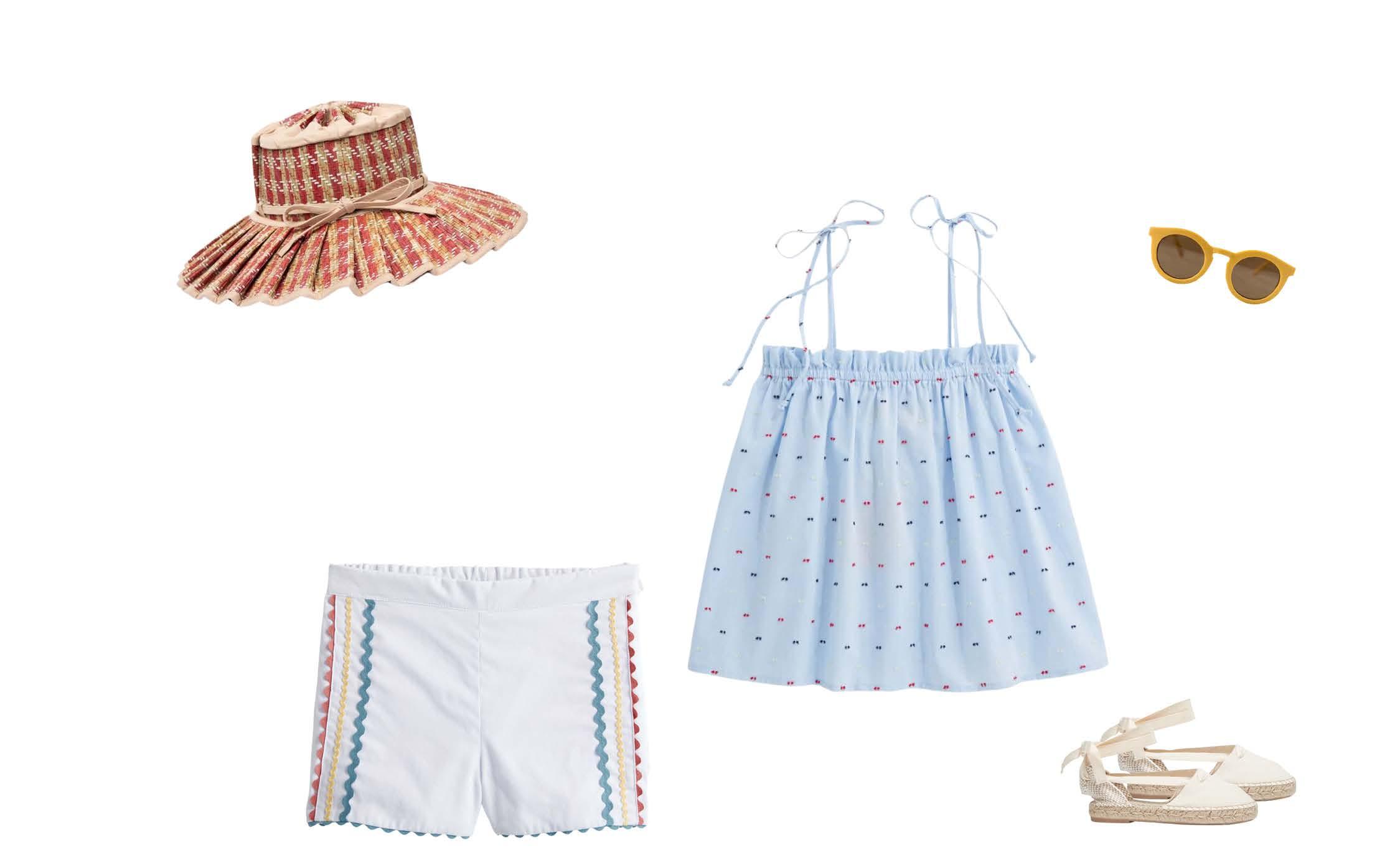 Luxe Capri Child Hat. Vernazza. One size. $136 | Ella Blouse. Chambray Plumetti. Sizes 4-10y. $48 | Sloane Short. White w/ Moody Blue, Yellow & Coral. Sizes 4-12y. $58 | Sunglasses. Mustard. One size. $15 | Classic Espadrilles. Cream. Sizes 2-4. $80