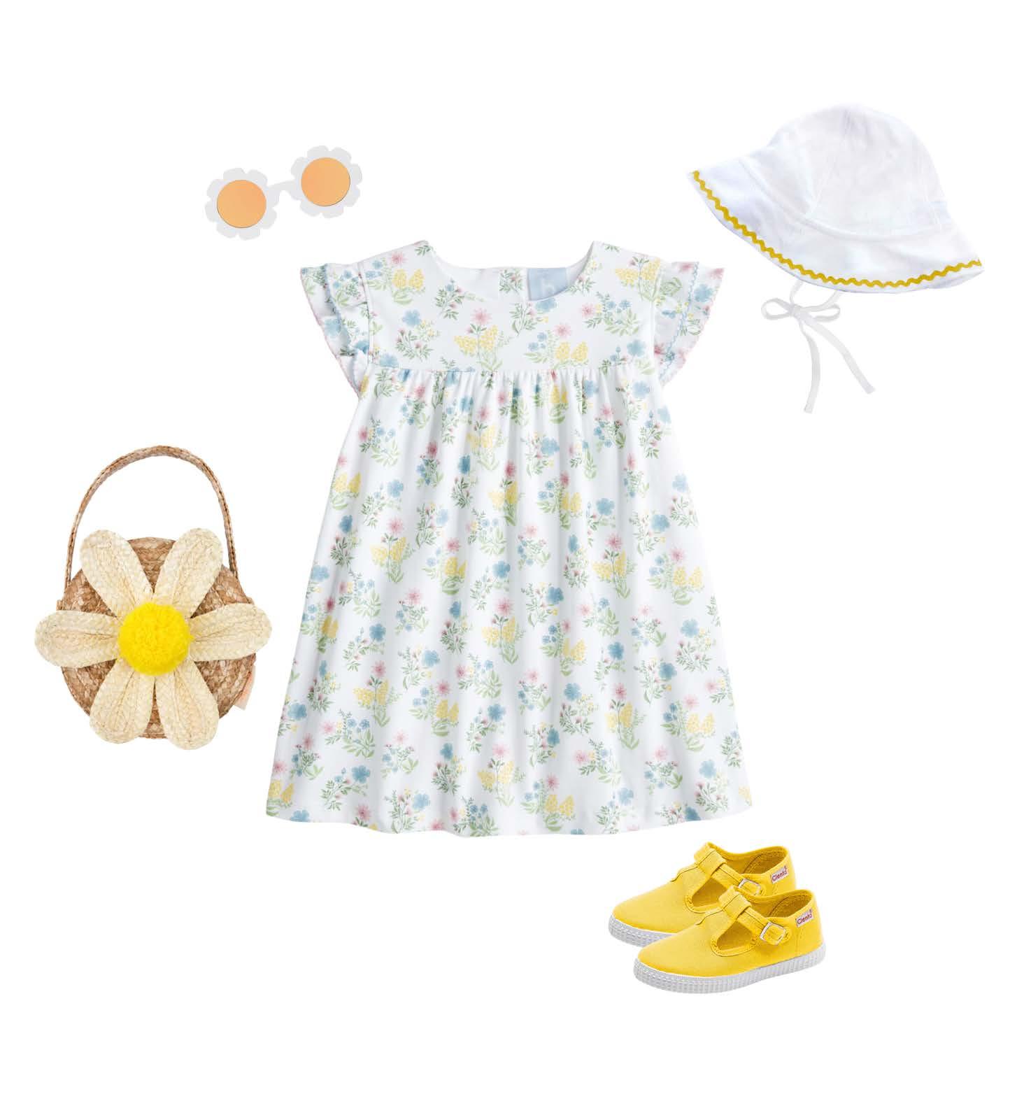 Benton Dress. Bea’s Bouquet. Sizes 12m-6y. $58 | Daisy Straw Bag. Natural. One size. $45 | T-Bar Shoe. Yellow.