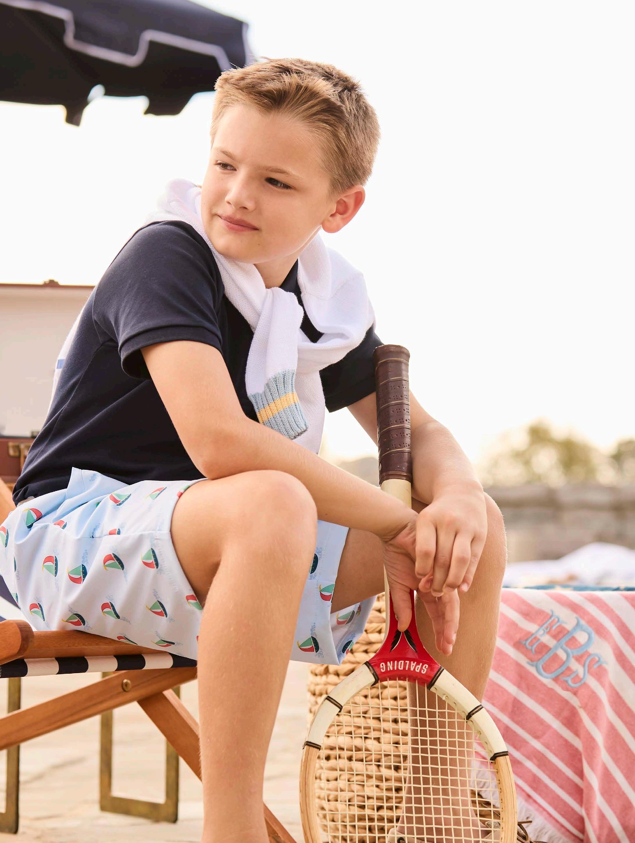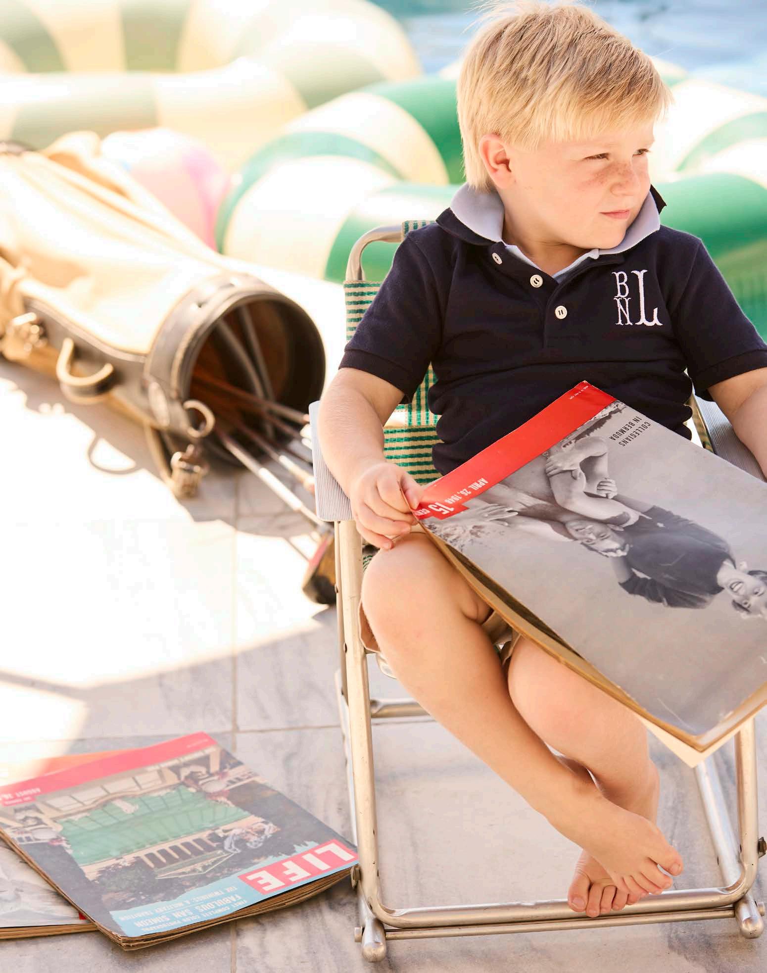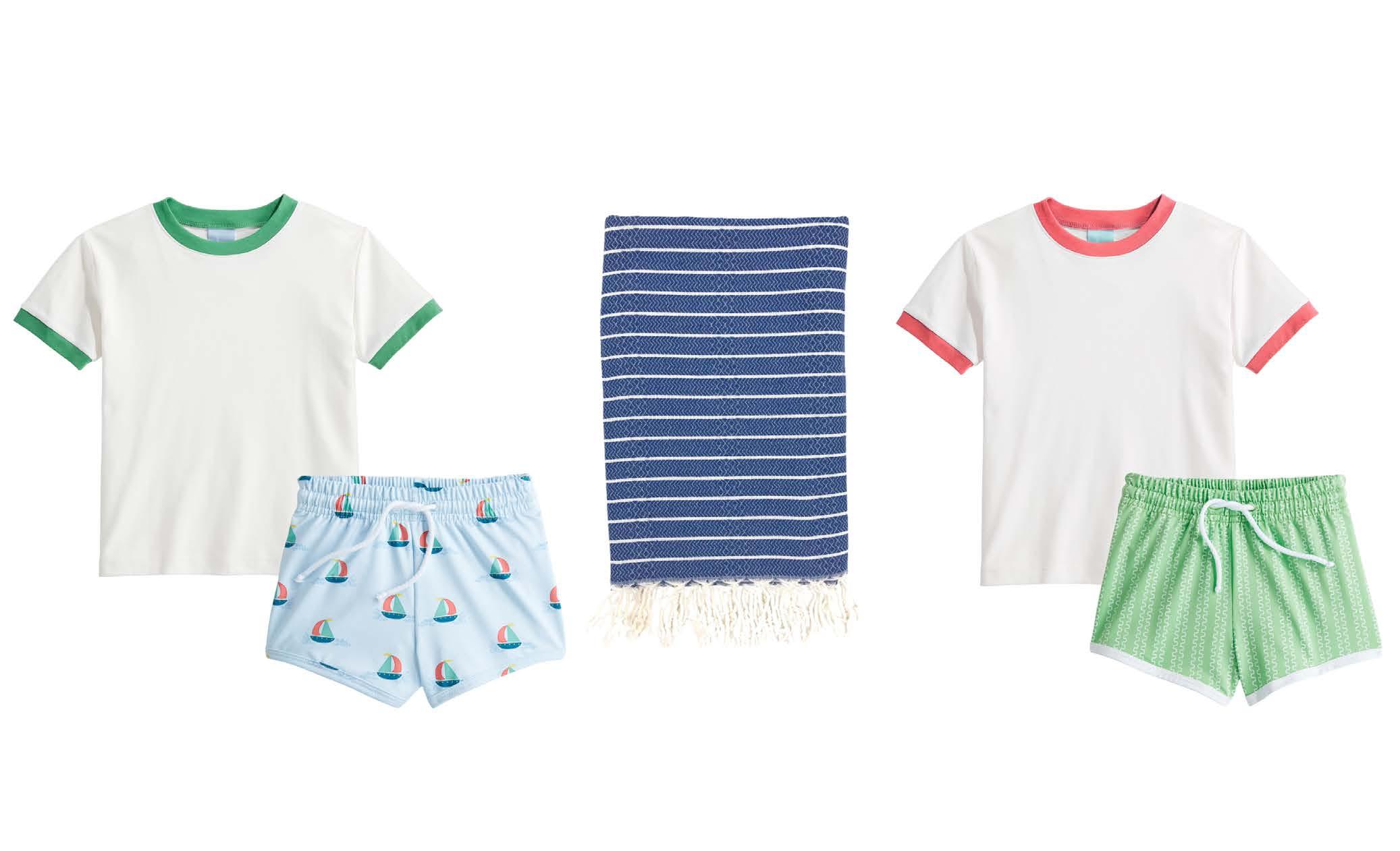 Striped Contrast Trim Pima Polo. Royal/White Stripe w/ Coral. Sizes 12m-14y. $48 | Gold Accent Sunglasses. Blue. One size. $15 | Colorblock Bayshore Swim Trunk. Navy w/ Blue. Sizes 12m-8y. $52 | Checkerboard Beach Bats. Ivory w/ Red. $30