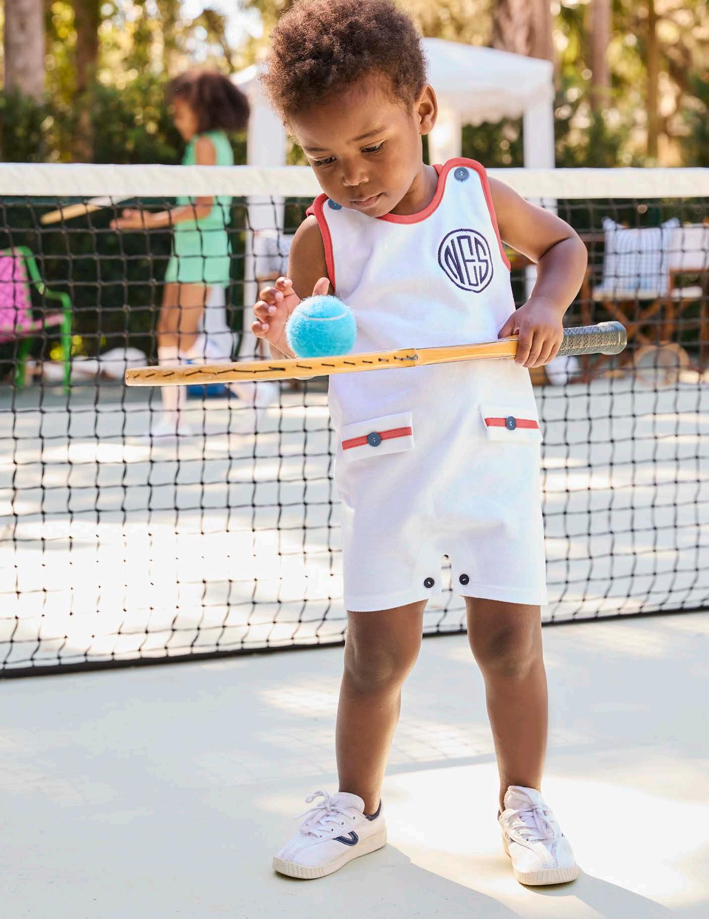 Jude Overall. White Pique w/ Pier Blue & Red. Sizes 6m-3y. $46