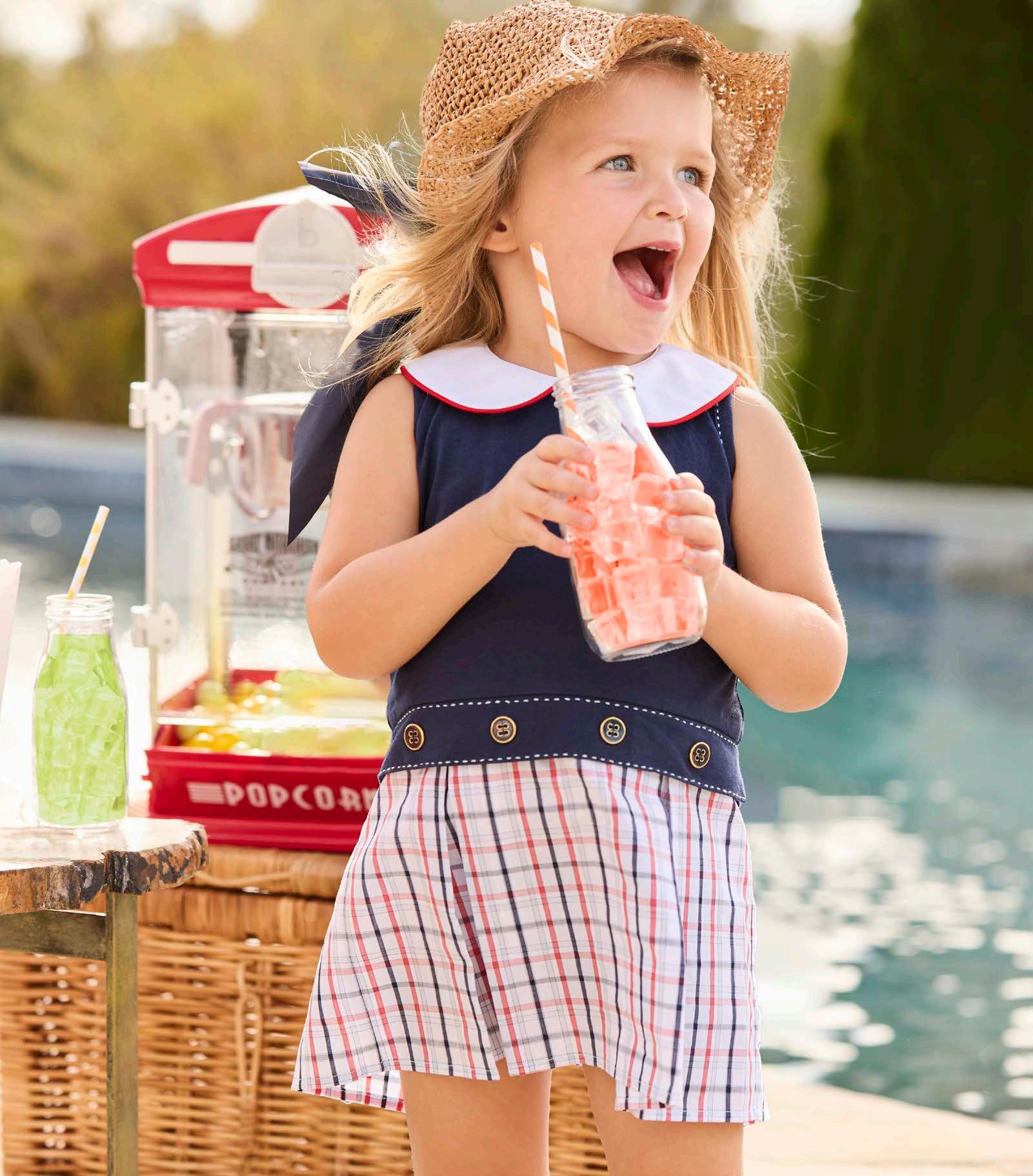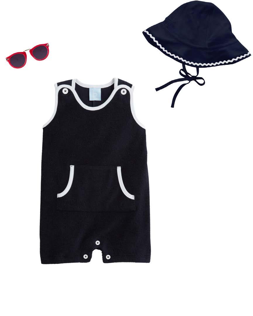 Gold Accent Sunglasses. Red. One size. $15 | Terry Jude Overall. Navy w/ White. Sizes 6m-3y. $46 | Calloway Sun Hat. Navy w/ White. Sizes s (6-12m), m, (12-24m), l (2-4y). $32