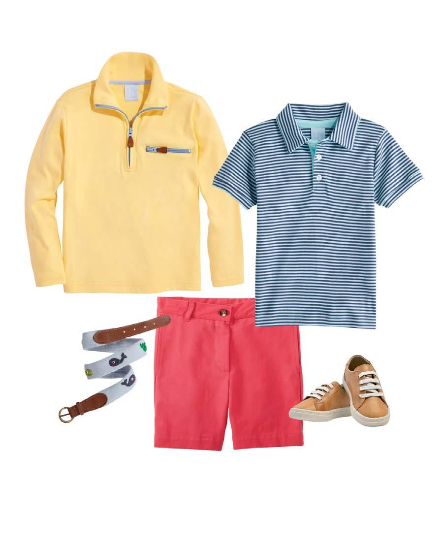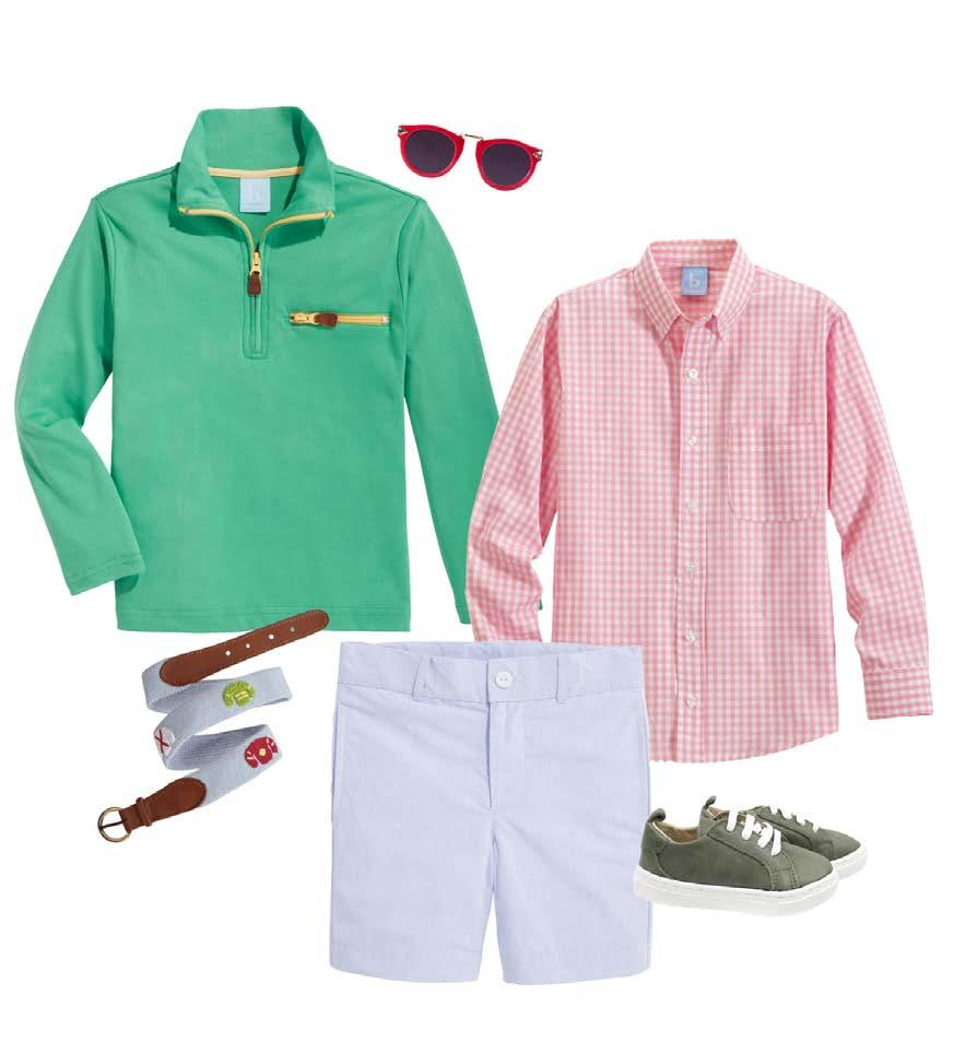 Pima Half Zip with Pocket. Green w/ Yellow. Sizes 2-14y. $62 | Buttondown Shirt. Pink Soft Check. Sizes 2-14y. $58 | Gold Accent Sunglasses. Red. One size. $15 | Crochet Belt™. Jockey Silks. Sizes s, m, l, xl. $52 | Wilson Short. Blue Chambray. Sizes 4-14y. $62 | Low Top Sneakers. Premium top-grain leather. Sage. Sizes 3-13. $64 limited availability.