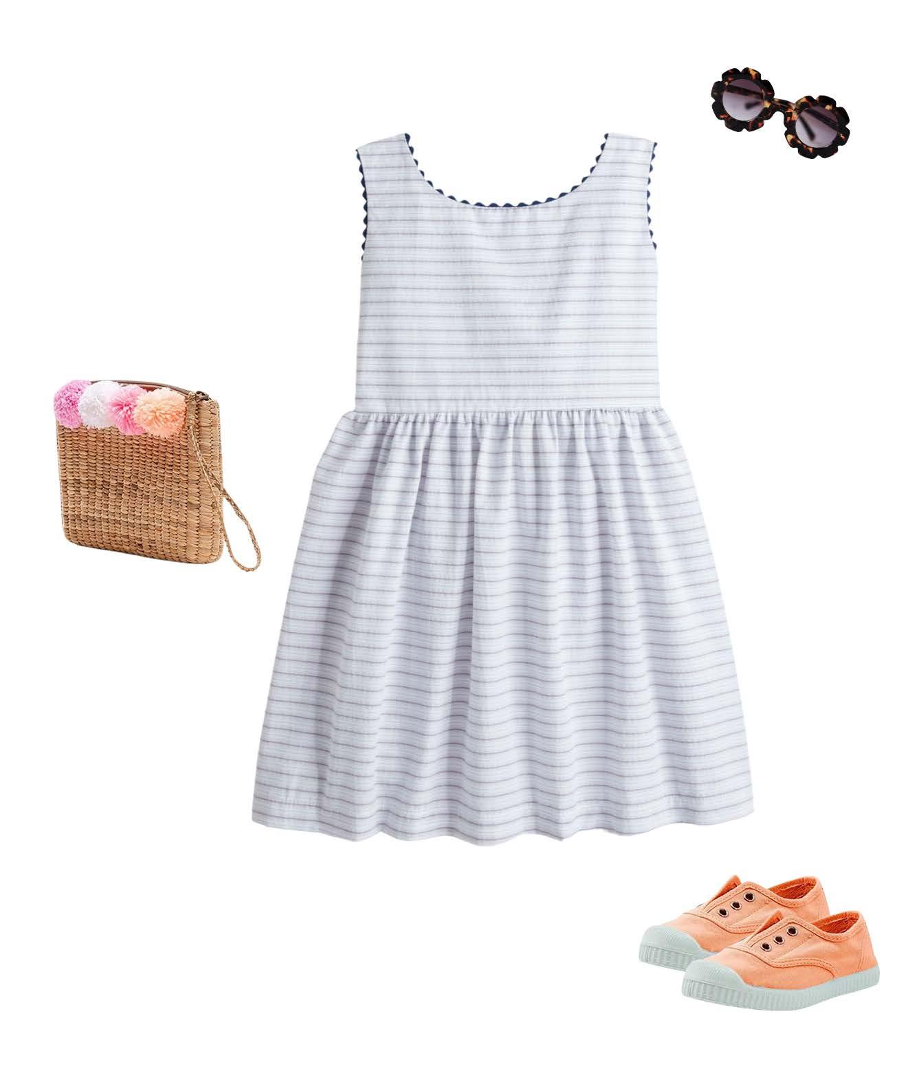 Open Back Dress. Navy Raya Stripe. Sizes 6-14y. $72 | Daisy Sunglasses. Amber Tortoise. One size. $15 | Wristlet Pouch Pom Pom. Eva Style. One size. $45 | Cienta Slip On Sneaker. Peach. Sizes 8.5-1. $39