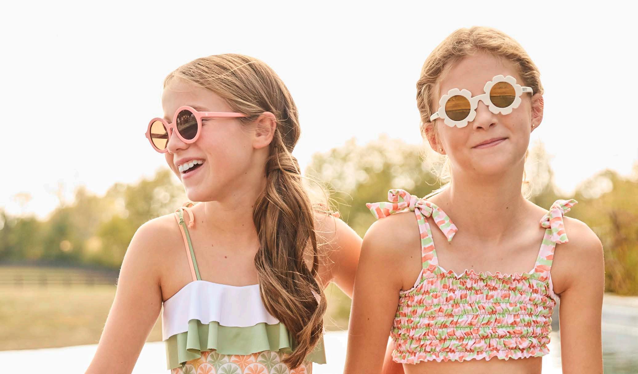 Babiators Euro Round Sunglasses. Peachy Keen. Sizes 0-2y, 3-5y and 6y+. $26 | Marilyn Smocked Two Piece Bathing Suit. Seascape. Sizes 4-12y. $76 | Ruffled Bathing Suit Bottom. Green. Sizes 12m-8y. $34 | Classical Jelly Sandals. Pink. Sizes 6.5-10.5. $29.99