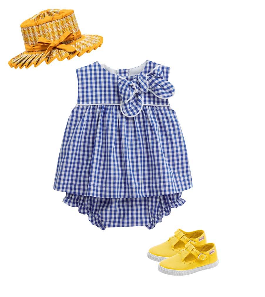 Clara Bloomer Set. Chambray Plumetti. Sizes 6m-3y. $62 | T-Bar Shoe. Yellow. Sizes 9-12. $38