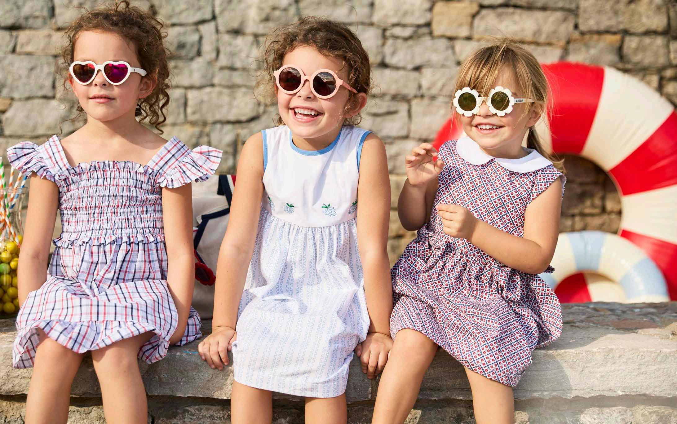 Babiators Cat-Eye Sunglasses. White. Sizes 0-2y and 3-5y. $26 | Peter Pan Sundress. Spring Berries. Sizes 12m-6y. $72 | Sleeveless Miriam Dress. Navy Jersey w/ Bayview Check. Sizes 2-10y. $72