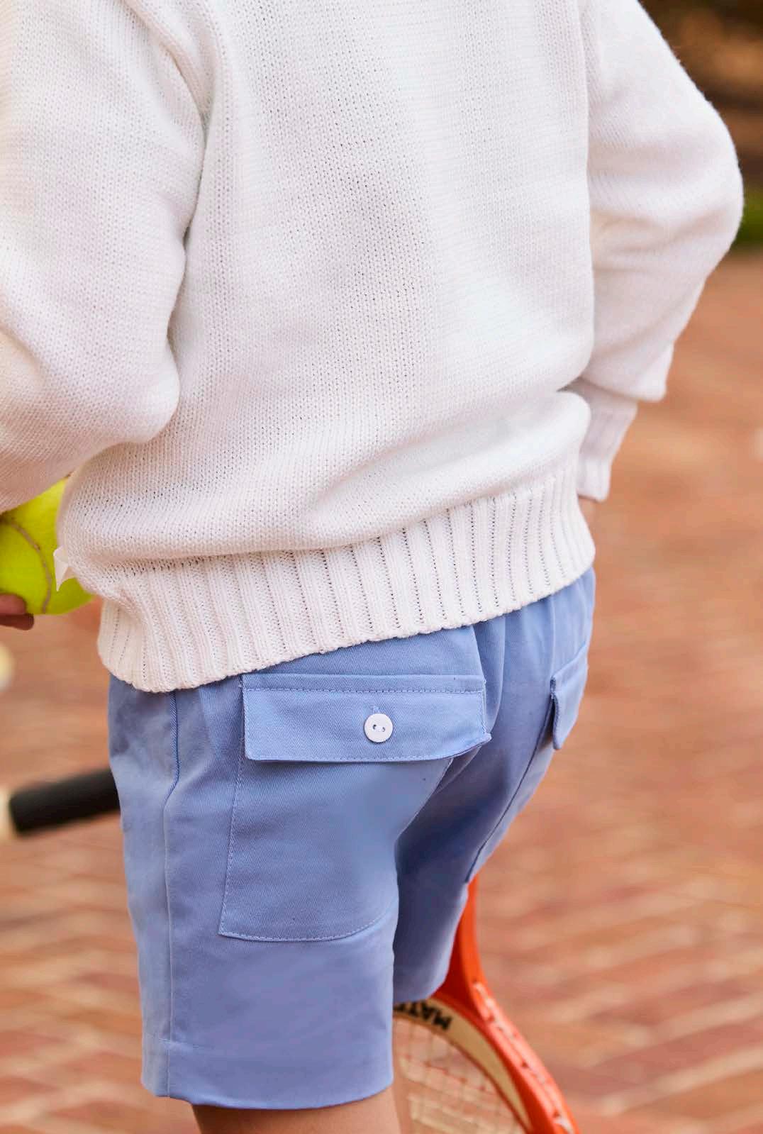 Intarsia Argyle Pullover. Ivory w/ Multicolor. Sizes 4-12y $88 | Twill Boy’s Play Short. Blue. Sizes 12m8y. $39