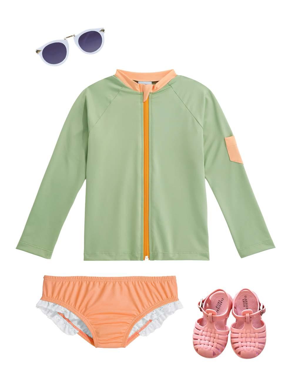 Gold Accent Sunglasses. White. One size. $15 | Zip Front Rash Guard With Pocket. Green w/ Orange. Sizes 12m-8y. $52 | Ruffled Bathing Suit Bottom. Orange. Sizes 12m-8y. $34 | Classical Jelly Sandals. Pink. Sizes 6.5-10.5. $29.99