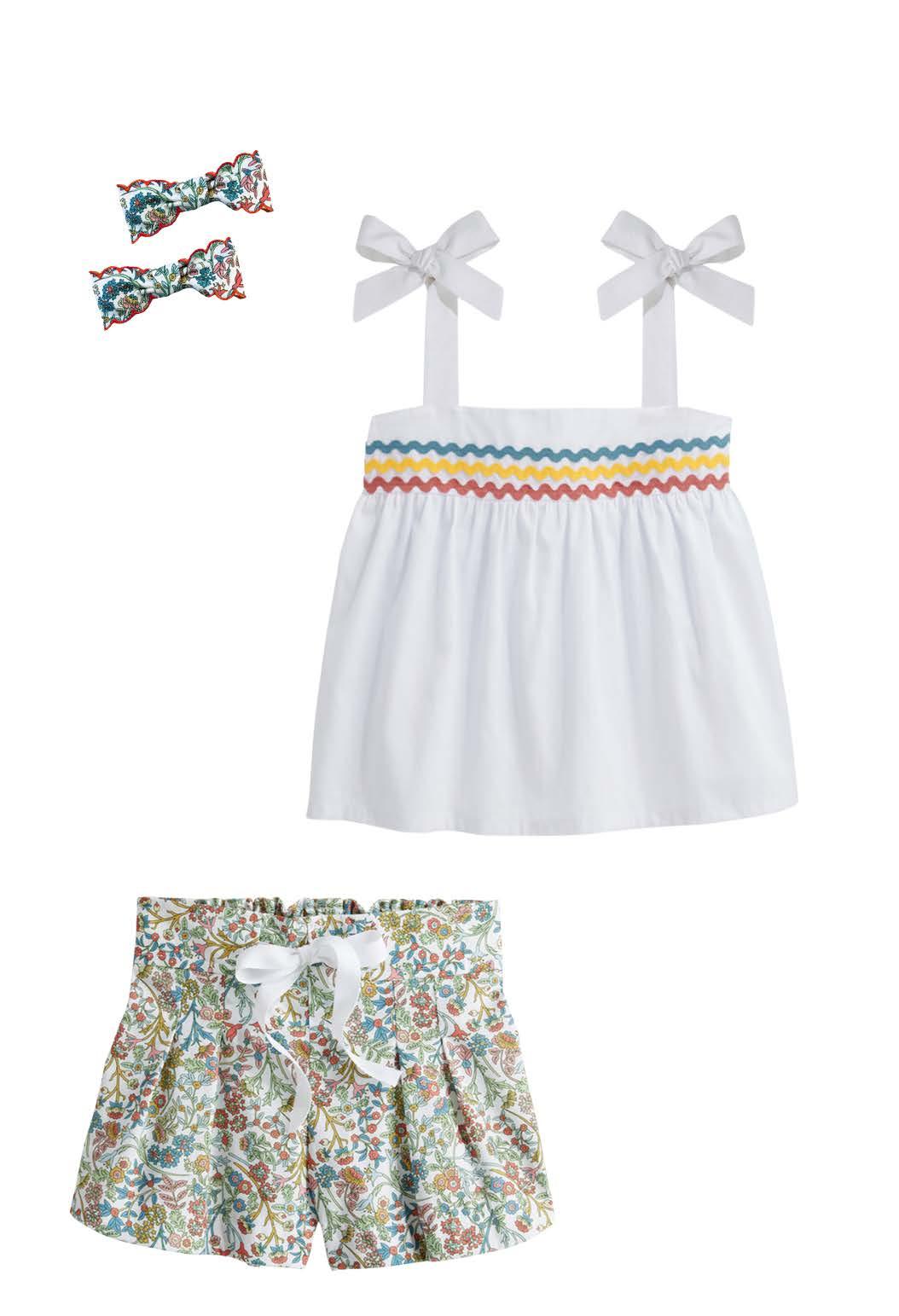 Scalloped Barrette. Pocketful of Posies. One size. $12 | Ric Rac Marcia Blouse. White w/ Moody Blue, Yellow & Coral. Sizes 4-12y. $52 | Printed Whitley Short. Pocketful of Posies. Sizes 2-10y. $48