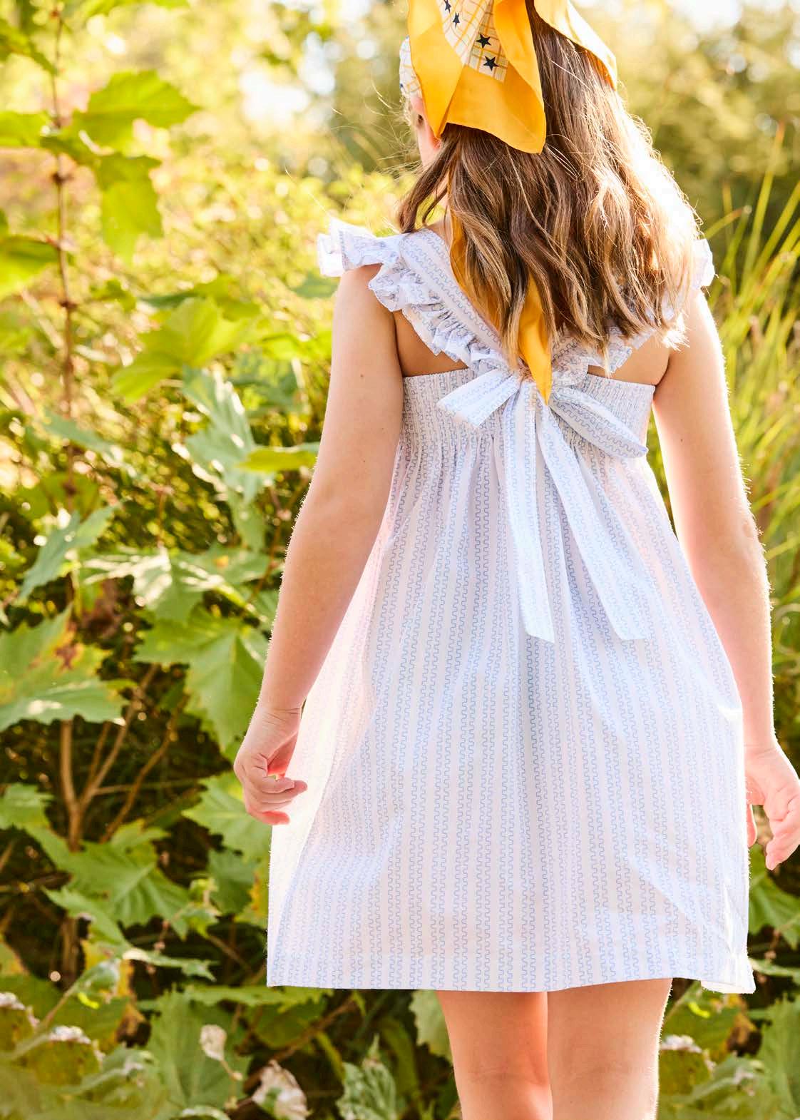 w/ Blue Ticking. Sizes 2-14y. $62 | Printed Performance Dress Short. Blue Ticking. Sizes 6-14y. $76 | Clara Bloomer Set. Chambray Plumetti. Sizes 6m-3y. $62