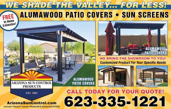 April 2024 | WelcomeHomeAZ.net 65 Retractable Awnings Lattice & Solid Patio Covers Window Awnings Shades PROMO CODE: EXPIRES: Buy Now, Pay Later, Financing Options Available Visit our Showroom to SAVE an EXTRA 5% OFF!* Must provide photos and rough measurements of the area to be quoted. May not be applied to existing or scheduled estimates. Offers valid on new orders only. Excludes Alumawood Patio Covers and Roman Pergolas. 450 E Watkins St., Phoenix, AZ 85004 • ROC 179338 • ROC 330966 PROMO CODE: WH0524 EXPIRES: 5/15/24