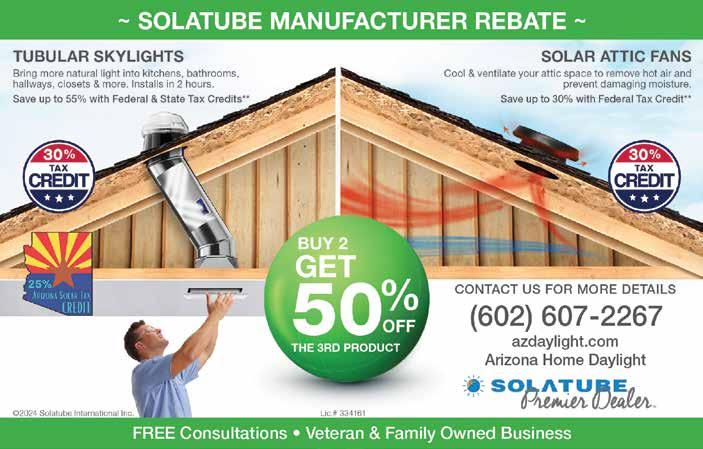 20 WelcomeHomeAZ.net | April 2024 CALL TODAY FOR A CONSULTATION 480-374-8140 “The concept of KeepTrack is brilliant! By using the ceiling of our garage for storage,we didn’t compromise any space in our garage... Problem solved!” 12 Tote System INSTALLED with Totes Complete! for only $499 27 Gallon Totes – 50 LBS each. www.KeepSpaces.com DIY Tracks Only for 6 Totes $199 LIFT OPTION SOLD SEPARATE 10” Tubular Skylight starting at $625 Installed (Tile Roofs $75 extra) 602-235-0536 3101 W. Thomas Rd., Suite 116, Phoenix, AZ www.azskylightguys.com • #1 skylight in the world • Low-E, Argon filled, double insulated tempered glass • Price starting at $525 SAVE UP TO $150 A YEAR ON ENERGY COSTS WITH OUR ENERGY SAVING SKYLIGHTS! • Professional installation, with no mess, in less than 2 hours • No leak guarantee • 4 sizes available, installs on any roof type