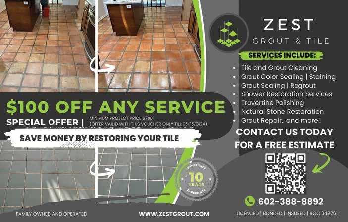 April 2024 | WelcomeHomeAZ.net 17 • BEAUTIFUL, INDUSTRIAL GRADE FLOORING SYSTEM • 20 TIMES STRONGER THAN EPOXY • TRANSFERABLE LIFETIME WARRANTY • ONE DAY INSTALLATION • GET BACK TO YOUR GARAGE QUICKLY! GuardianGarage.com GARAGES • PATIOS • BASEMENTS • AND MORE! GUARDIAN GARAGE FLOOR COATING of 500 sq ft. or more Homes requiring less than 500 sq. ft. will receive a prorated discount. Valid on day of demonstration only. All homeowners must be present for demonstration. Not valid with other discounts. Expires 5/31/24. ROC# 340877