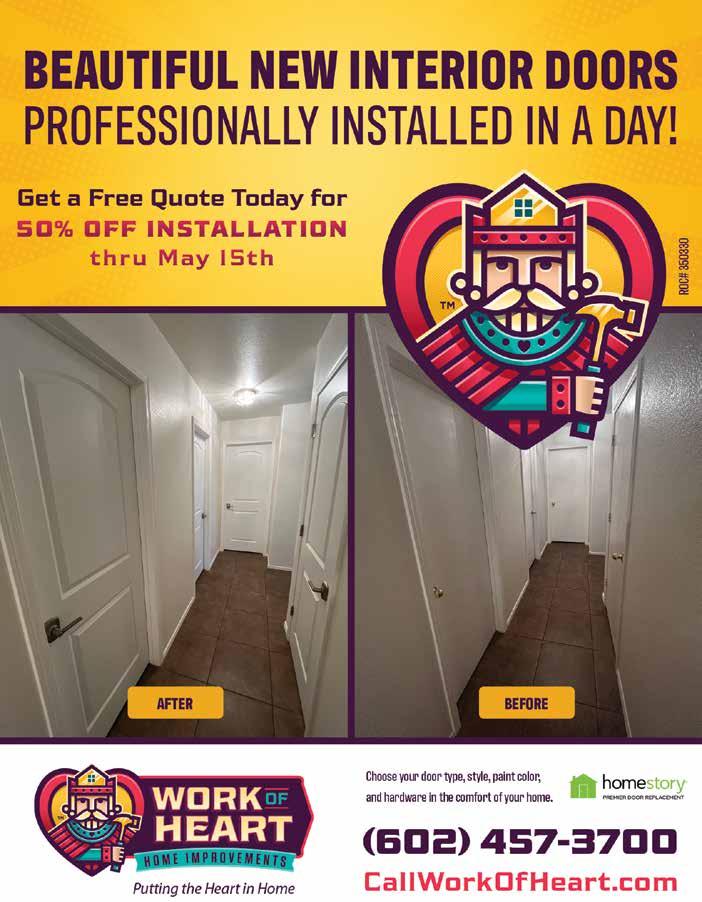 April 2024 | WelcomeHomeAZ.net 47 YOUR DOOR, OUR GLASS! After AZ ROC#202227 Who We Are As an Arizona contractor and family run business for over 17 years, we strive to have every client thrilled with their new door transformation! We look forward to meeting you, WE BEAT EVERYONE’S PRICES! GUARANTEED FREE LOCK SET with any door or gate purchase Protecting your home never looked so elegant! GRAND IRON DOORS • DELUXE IRON GATES SOLID IRON DOORS starting at $2995 GLASS INSERTS 40% OFF DELUXE COURTYARD GATES Must mention this ad. Offers may not be combined. Expires 5/15/24. FREE Lock and Iron Pulls 40% OFF Includes Installation! ON SALE! A BEAUTIFUL HOME Starts At YOUR Front Door Also available with Opening Glass With Screen using YOUR DOOR! Fresh air without the bugs! YOUR DOOR, OUR IRON! DON’T GET A NEW DOOR, UPGRADE YOUR EXISTING DOOR FOR A FRACTION OF THE COST! Before After Before OFF!