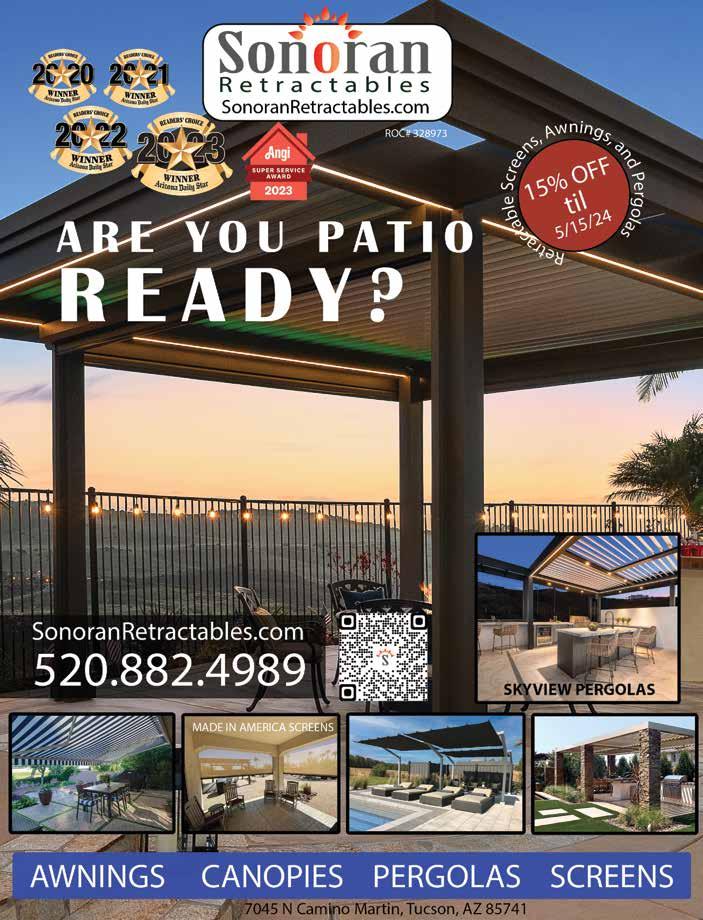 April/May 2024 | WelcomeHomeAZ.net 23 ARIZONA POOLS & DESIGN NEW CONSTRUCTION of Fiberglass & Concrete Pools Licensed / Bonded / Insured Arizona Pools & Design LLC KA-5 Dual ROC#332472 520-392-7171 1870 W Prince Rd. Suite 38 Tucson, AZ 85705 AZPOOLDESIGN.COM We Install Quality IN-GROUND Swimming Pools & Spa Hot Tubs COMPLETE YOUR BACKYARD OASIS WITH Hardscape, Landscape Design & Installation Pavers & Travertine / Artificial Grass / BBQs & Firepits / Exterior Tiling / And Much More... Financing Available! $500 AnyOFF New Pool Call for Details