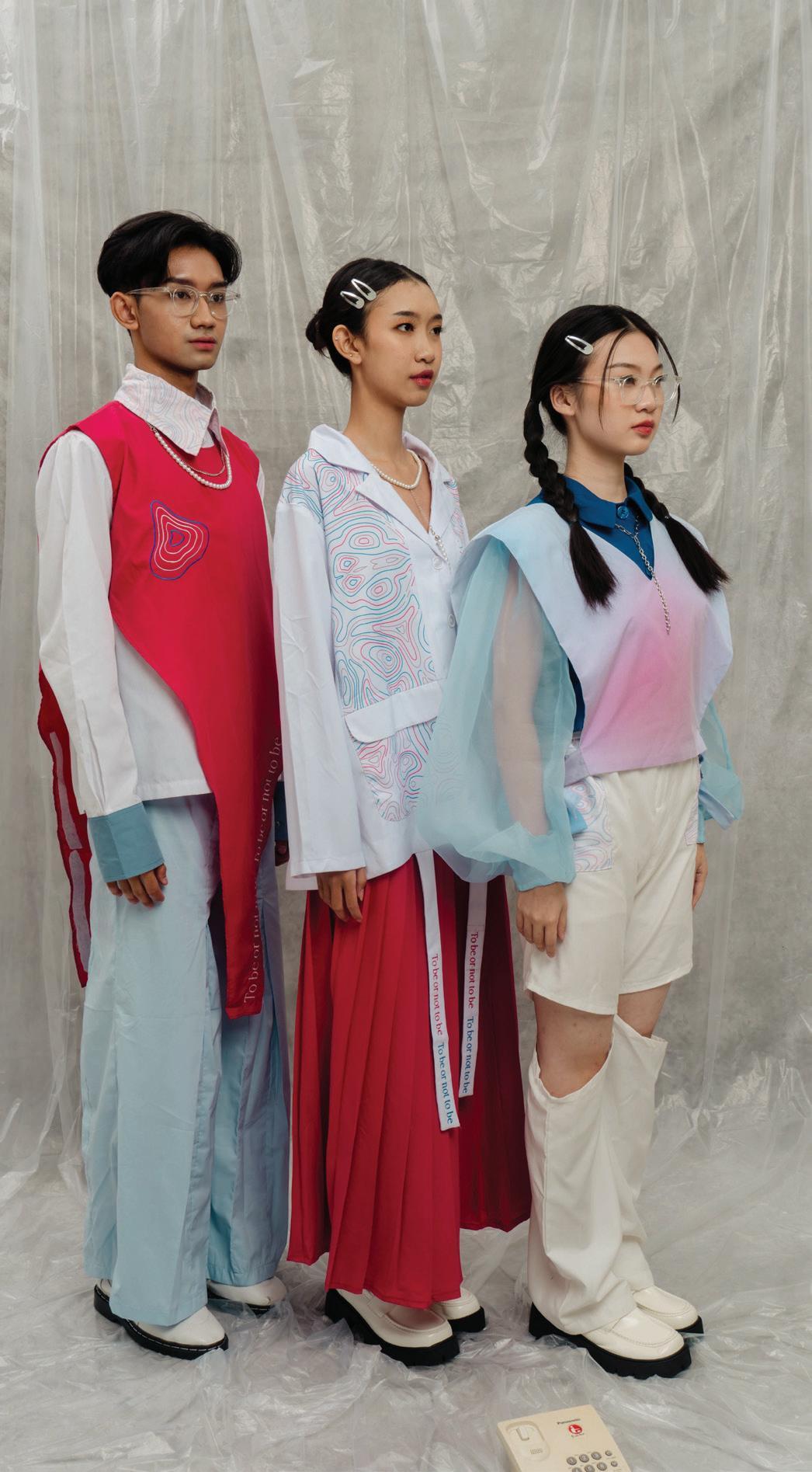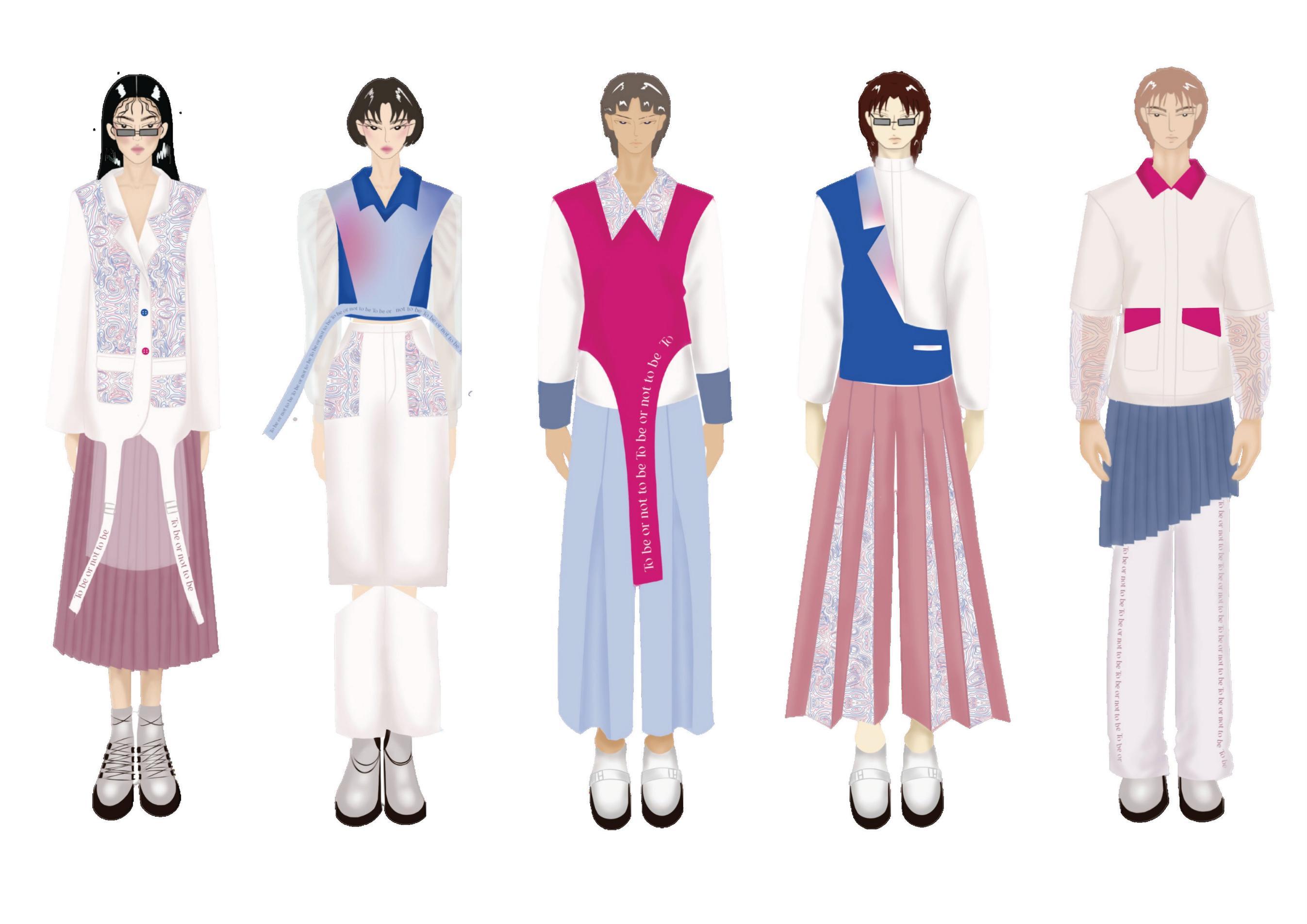 Mengangkat konsep mengenai fluktuasi antar gender dalam gender dysphoria. Didapatkan visualisasi gender fluid dalam fashion dan interpretasi dari gender fluid yaitu garis yang berliku-liku, dengan pemilihan warna biru dan pink dan mood yaitu “blue is no longer reserved for boys, and pink is not only for girls” yang menggambarkan keseluruhan konsep dari gender fluid dalam gender dysphoria.