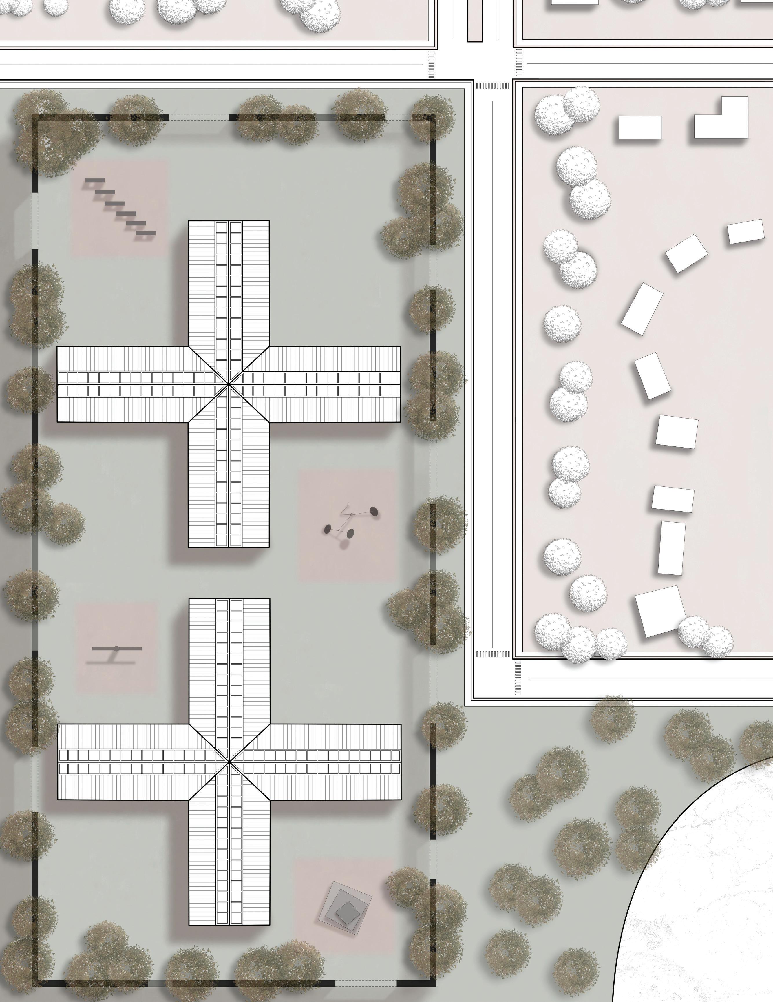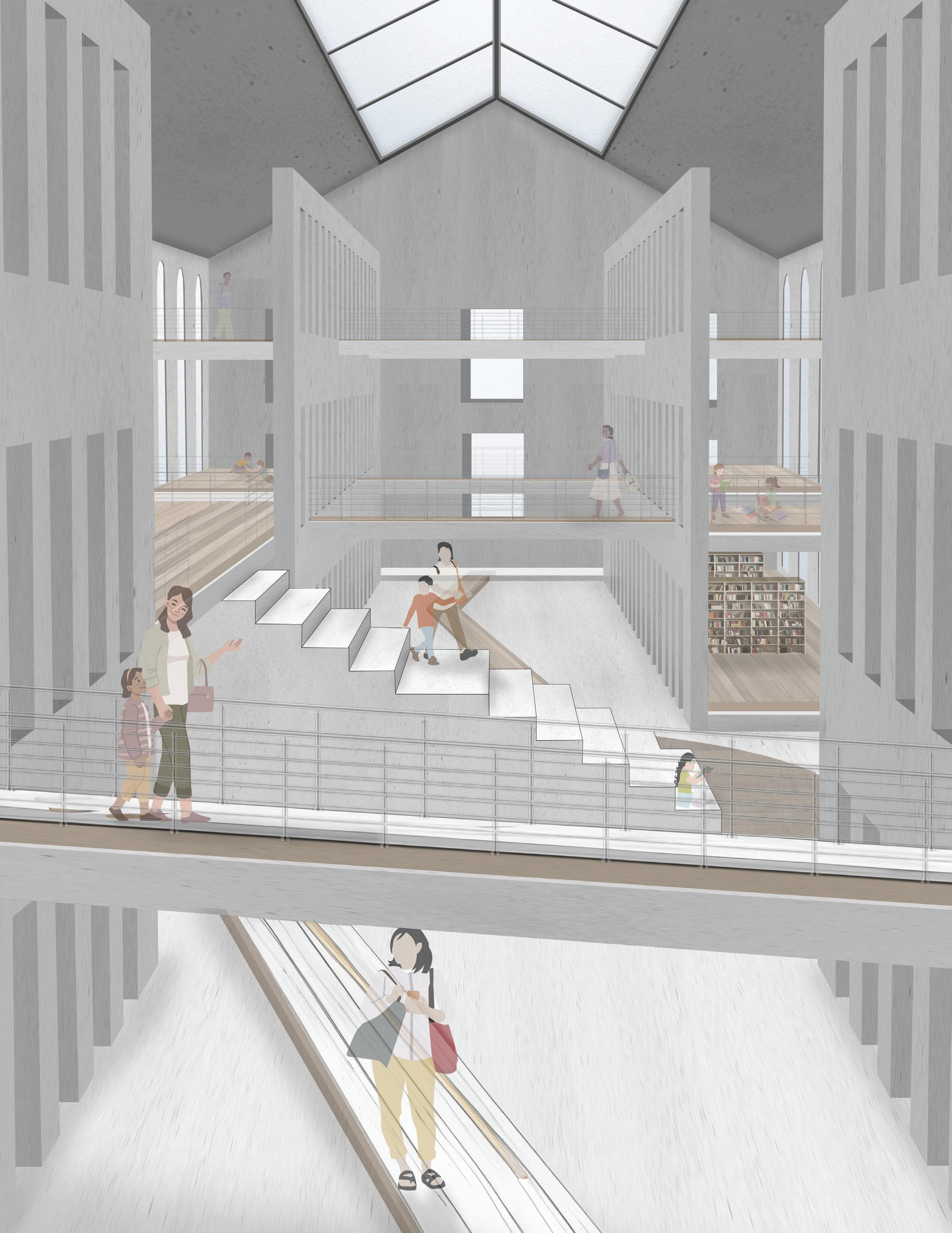 educational and communal spaces, specifically containing a Montessori school and a public library. This transformation aims to replace feelings of isolation with integration, and uses architecture as a guide to foster community engagement
