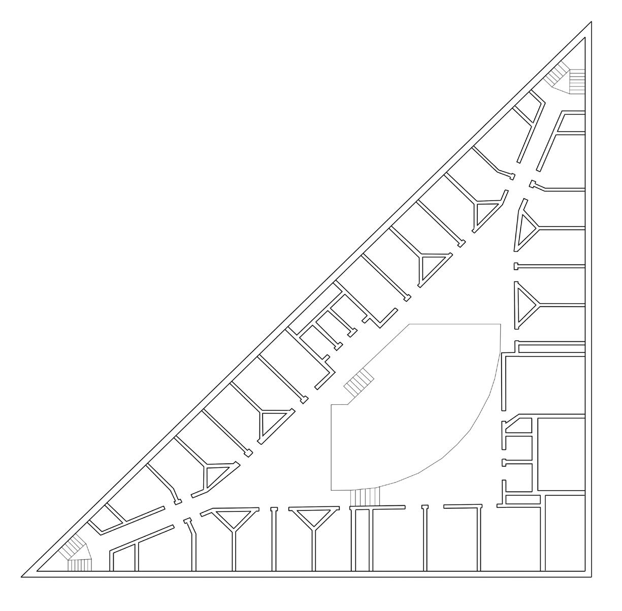 Architecturally, the triangle form facilitates enhanced surveillance with fewer blind spots due to the angular views provided by the triangular configuration. Each corner of the triangle can serve as a strategic point for security, allowing guards comprehensive visibility into the intersecting corridors. This layout also allows for the incorporation of more communal and rehabilitative spaces within the triangular sections, which are designed to be multifunctional, serving as areas for education, therapy, and social interaction.