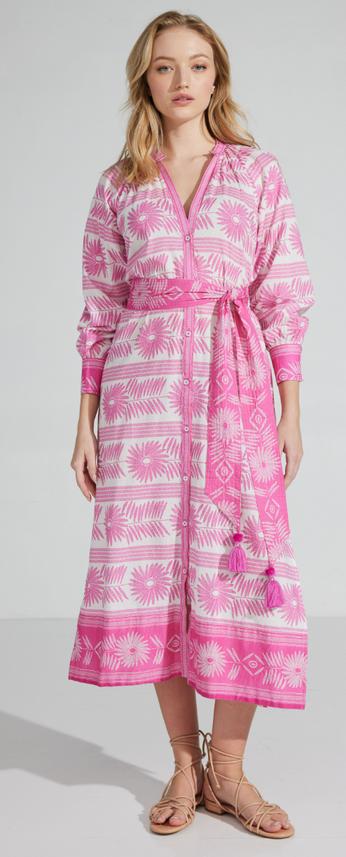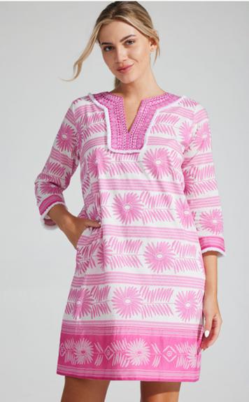 100%cottonborderprintinhotpinkandwhite.Hand embroideryandbeadingatthenecklineofthecapslvand tunicdresses.