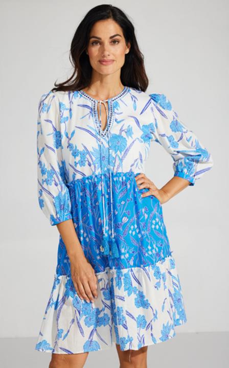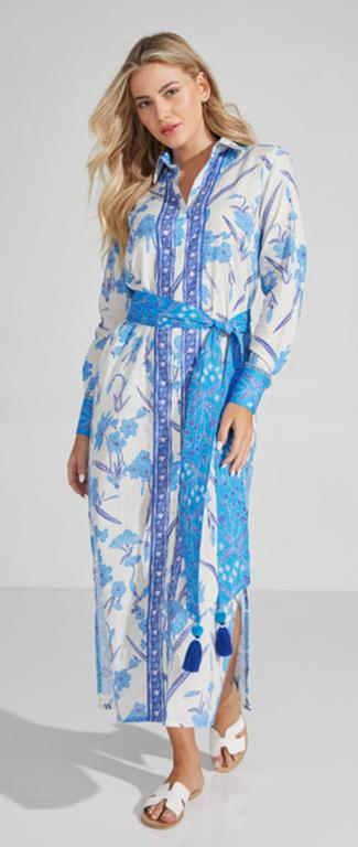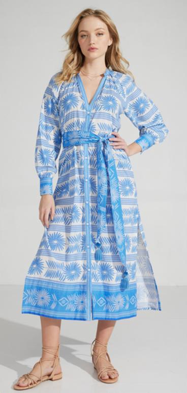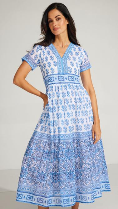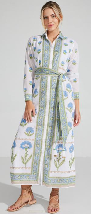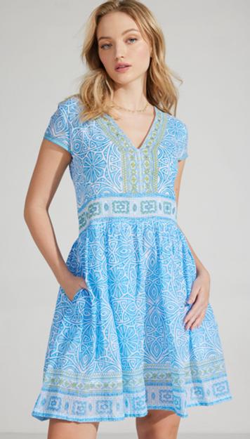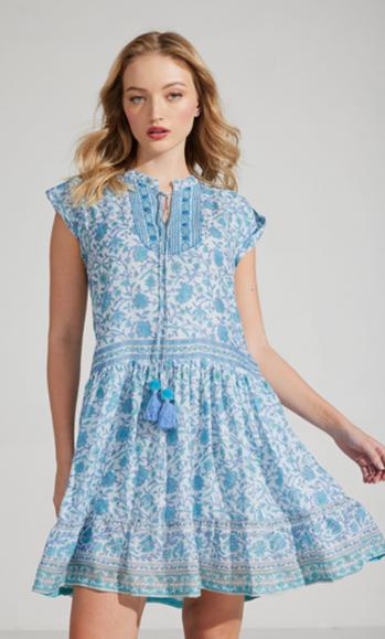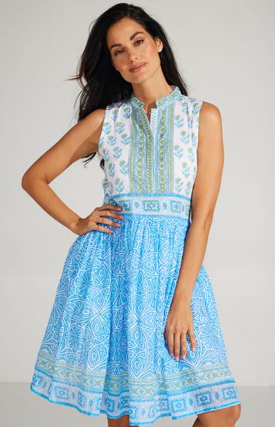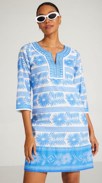 100%cottonborderprintincornflowerblueandwhite.Hand embroideryandbeadingatthenecklineofthecapslvand tunicdresses.