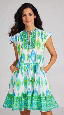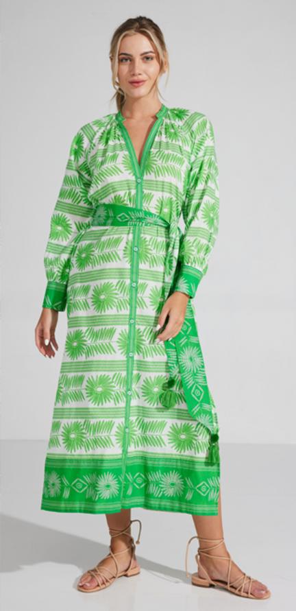 100%cottonborderprintinvibrantgreenandwhite. hand beadingandembroideryatthecapsleeveneckline.