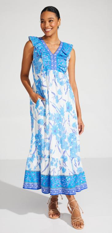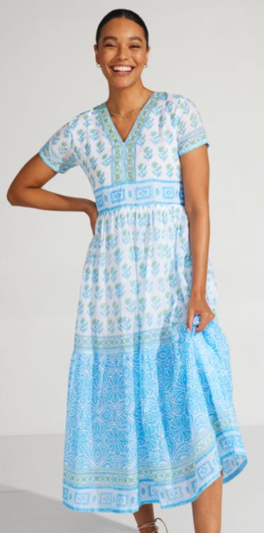 100%cottonIkatborderprintsinshadesofblues,turqand citrus.Handembroideryandbeadingattheneckline.
