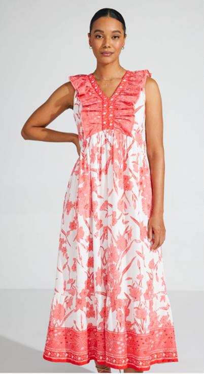 100%cottonmixedborderprintsinshadesofpoppy.Hand embroideryandbeading.