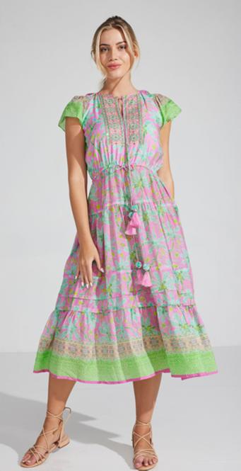 100%cottontropicalprintinshadesofhotandlightpinks, lemon,citrusandgreensaccentedwithhandembroidery andbeading.